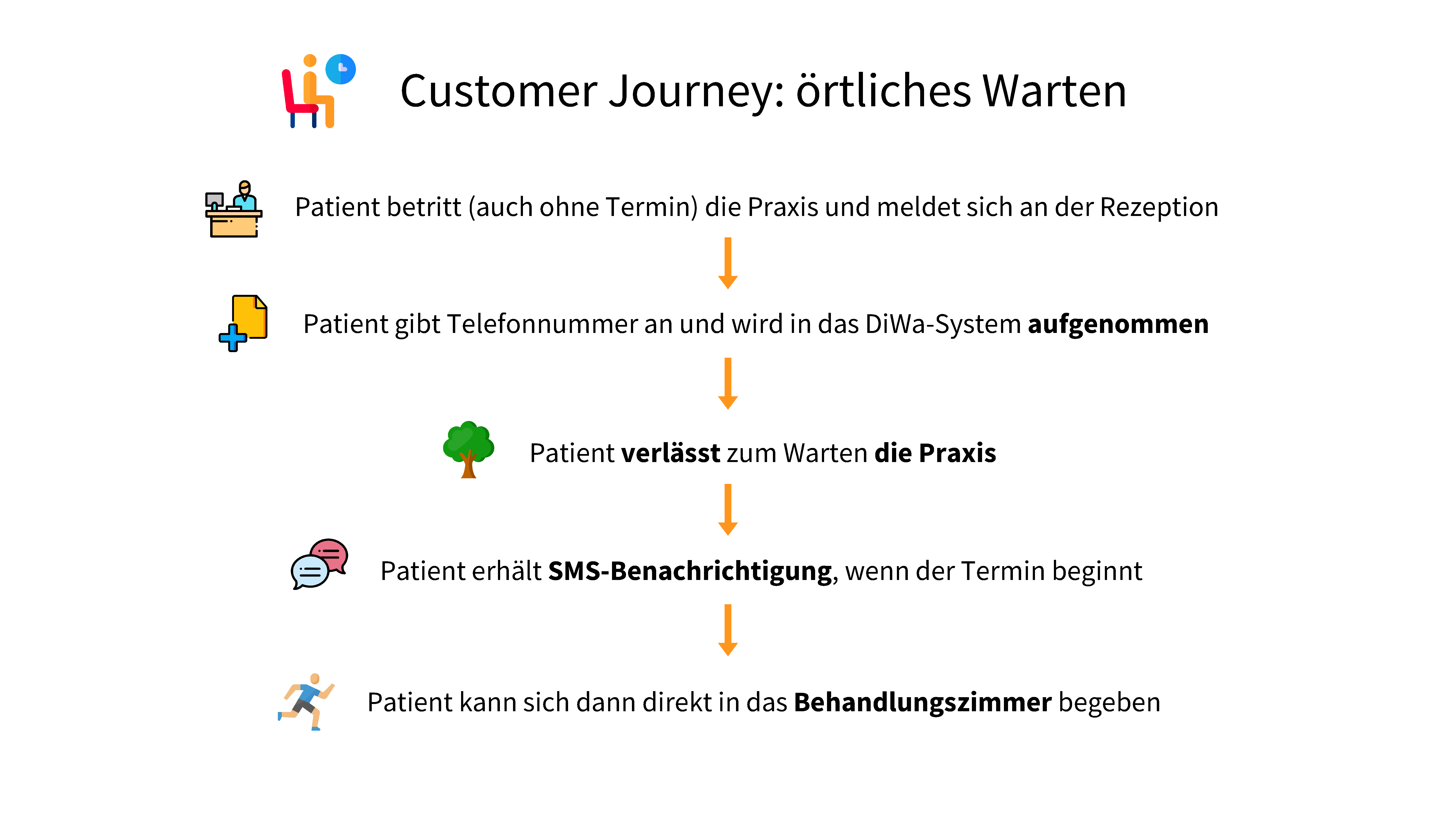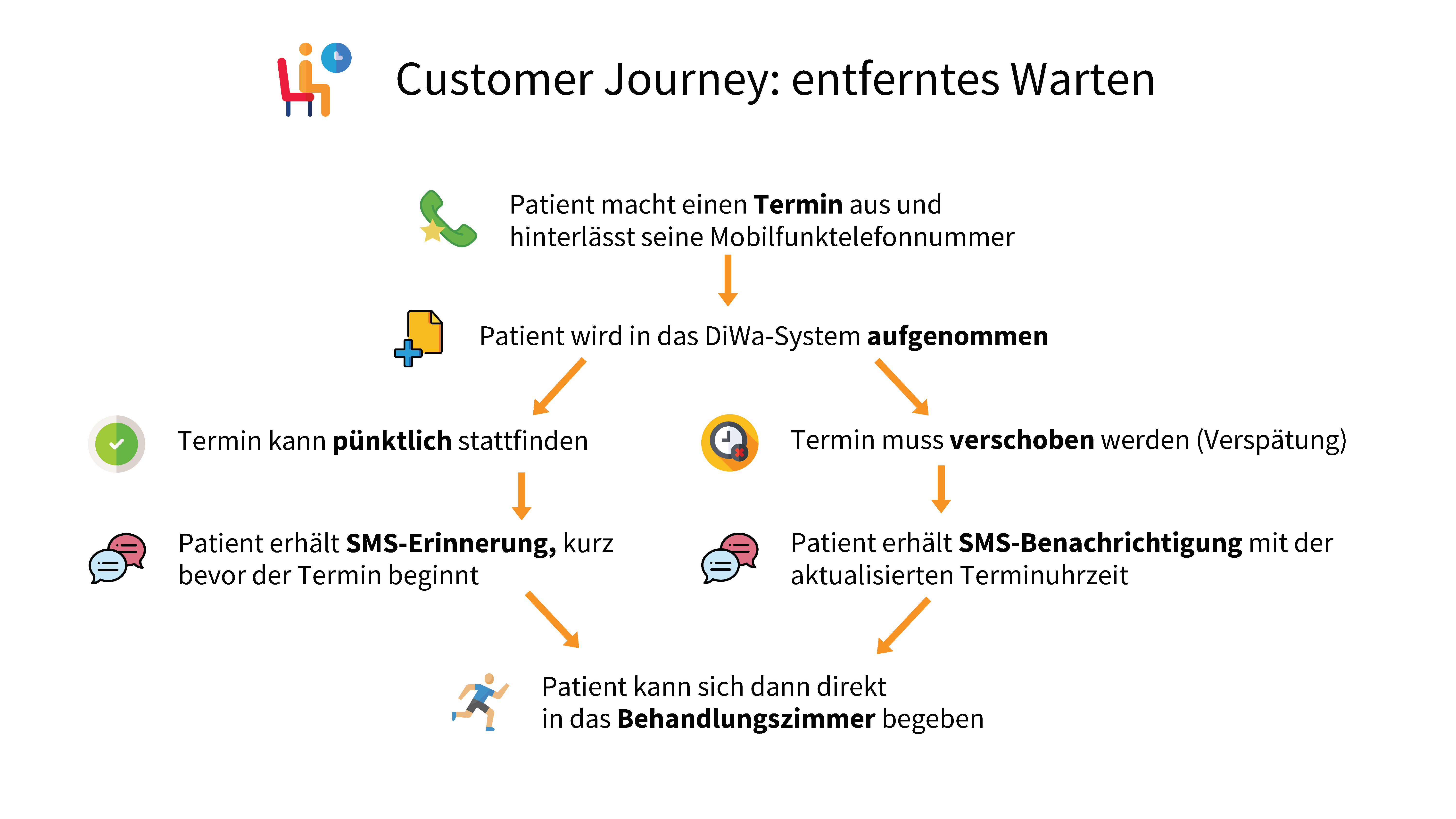 Sollte sich nun der Zeitpunkt des Termins verschieben müssen, wird dem Patienten automatisch eine SMS mit der nun aktuellen, geschätzten Uhrzeit des Termins sowie der verbleibenden Wartedauer zugesandt. Daran kann er sich orientieren, und anschließend (auch nach Empfang einer automatischen Terminerinnerung via SMS, kurz bevor die Behandlung starten kann) direkt zur passenden Uhrzeit die Praxis betreten und direkt zum Behandlungsraum gehen.