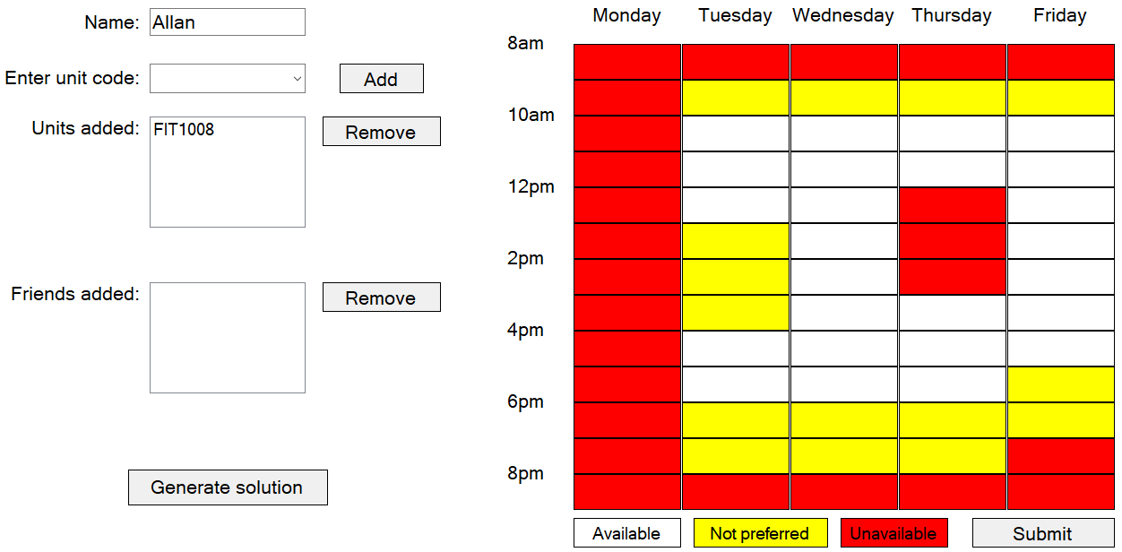 GUI Our resident C# expert Allan Chan designed and created the interactive interface from scratch. He designed a way for the student inputs to be stored in its own database and interact with the Python backend. After the algorithm has processed the data, the GUI retrieves the data and outputs it in an intuitive manner on a simple-to-read timetable.