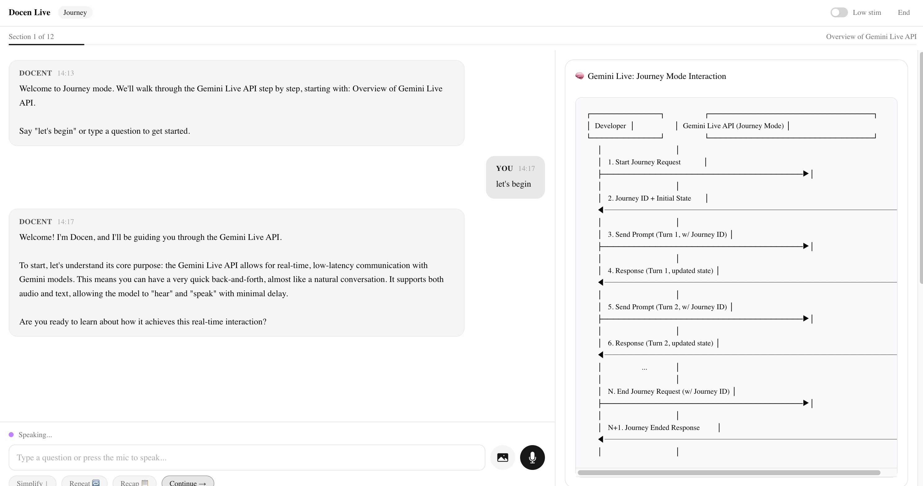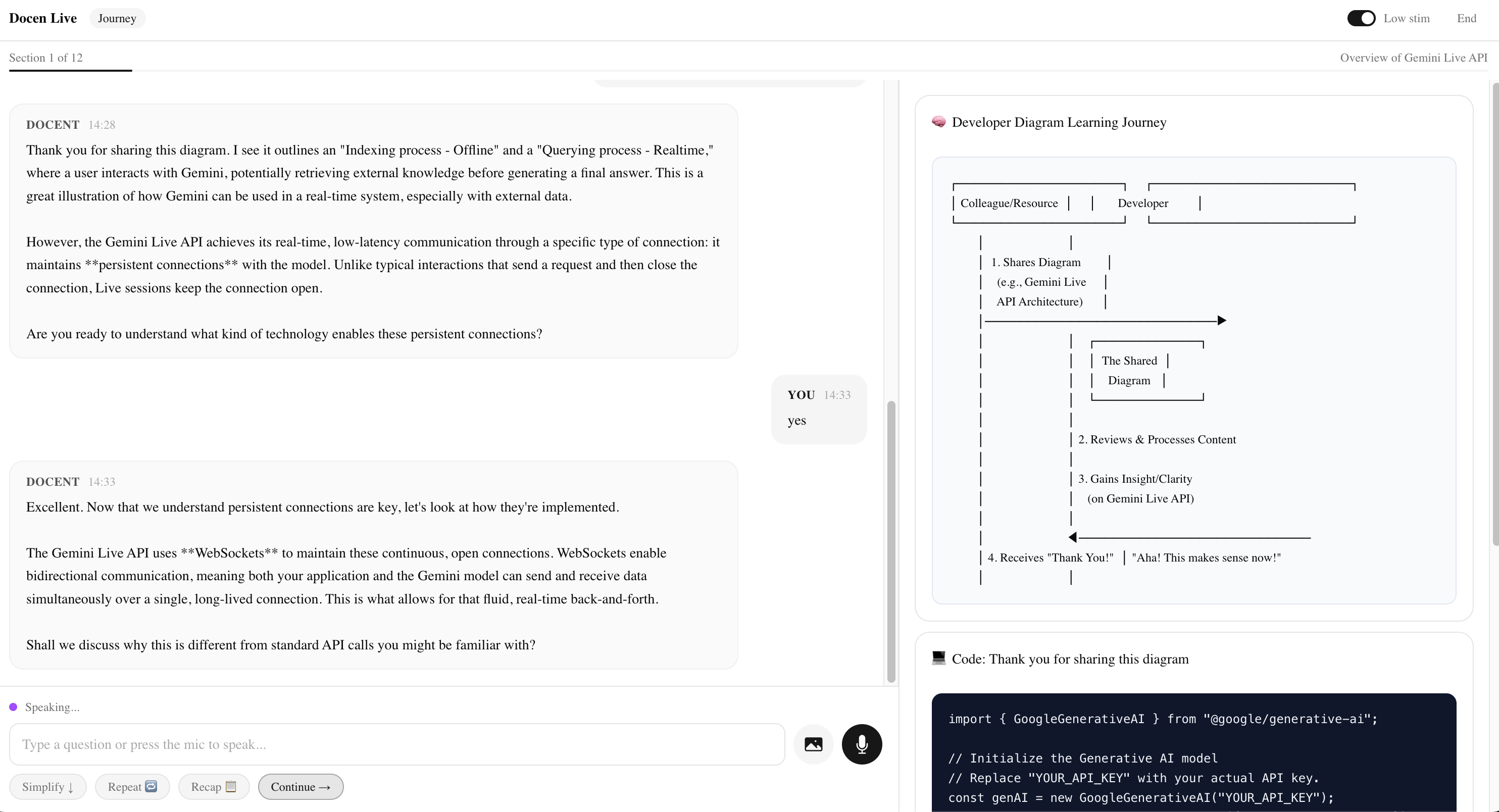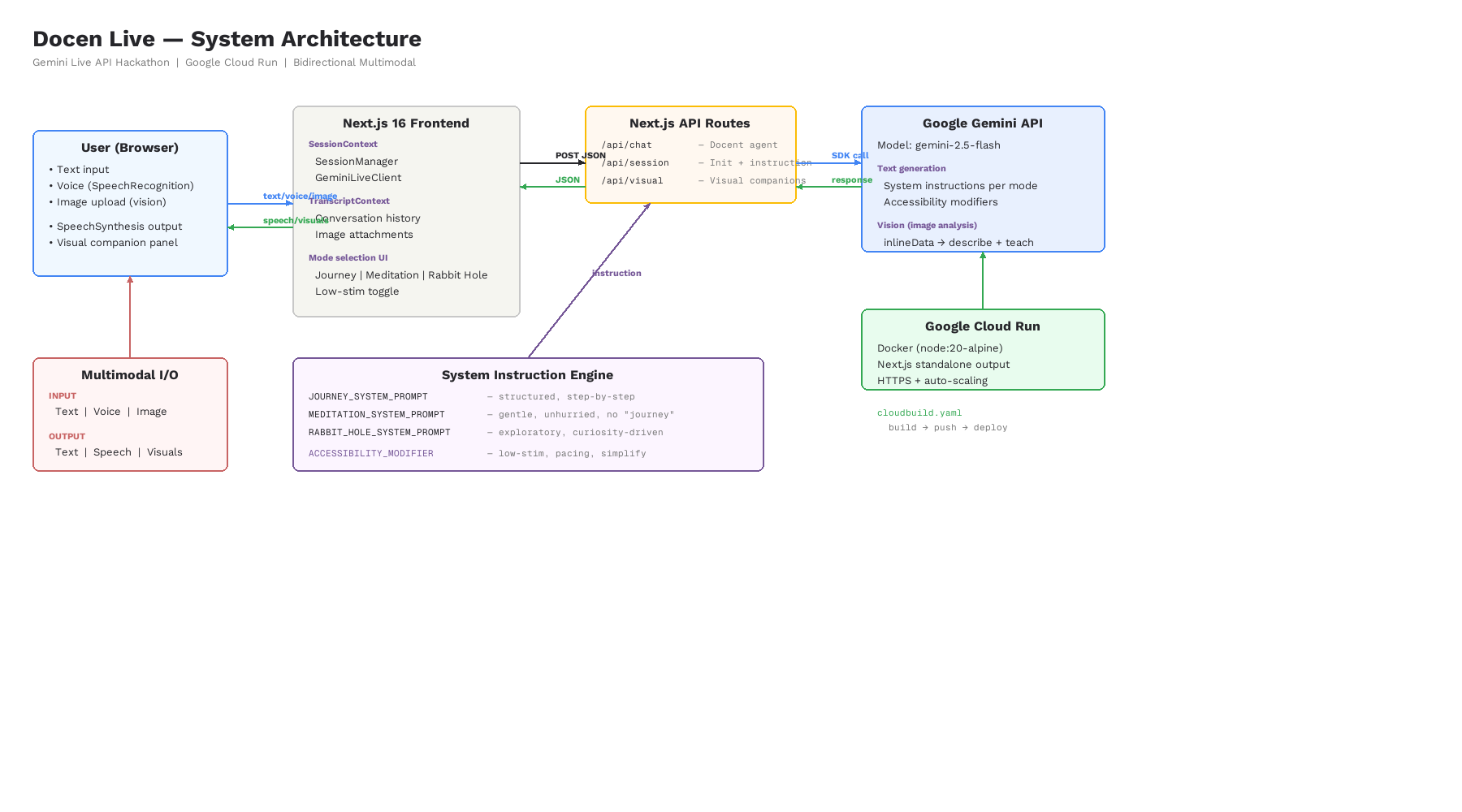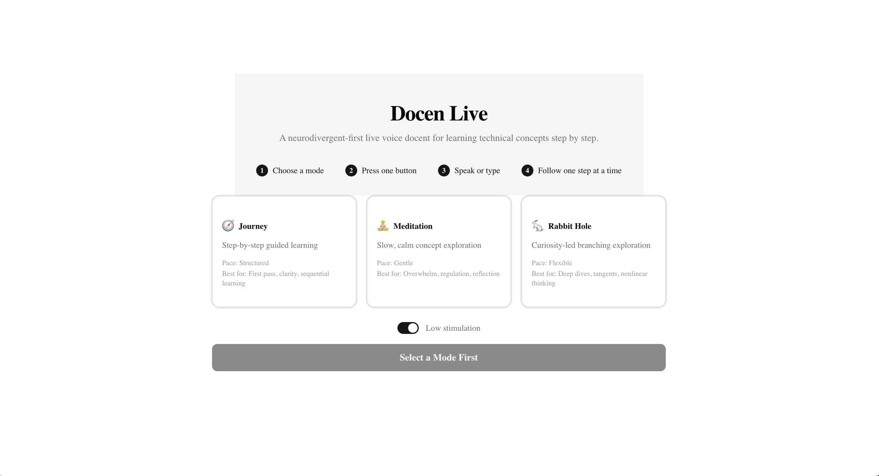 Docen Live is a neurodivergent-first, multimodal voice docent that transforms official Gemini API documentation into a guided learning experience. Users choose from three learning modes (Journey, Meditation, Rabbit Hole), interact via voice, text, or image, and receive spoken explanations with real-time transcript and visual companion panels. Seven accessibility features ensure the experience works for learners with ADHD, autism, anxiety, dyslexia, or cognitive fatigue.