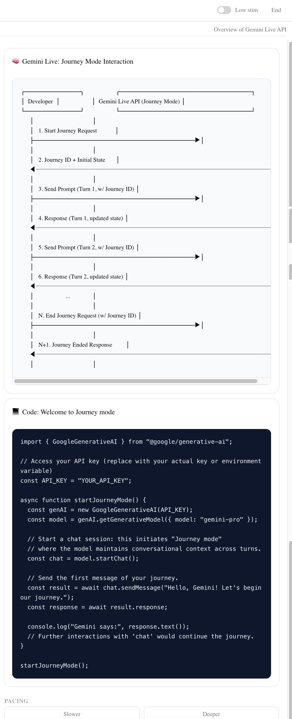 Scene 5 — Visual Companions (~10s) 🖱️ Scroll the right panel so both visual cards are visible. Hold. 🎙️ "Every response generates two visuals — a conceptual diagram that shows how things connect, and a code reference that shows how to use it. My brain doesn't absorb a paragraph and just understand. I need to see the architecture. I need to see the code. Those are two different kinds of understanding, and a lot of us need both at the same time. Gemini generates both in real time."