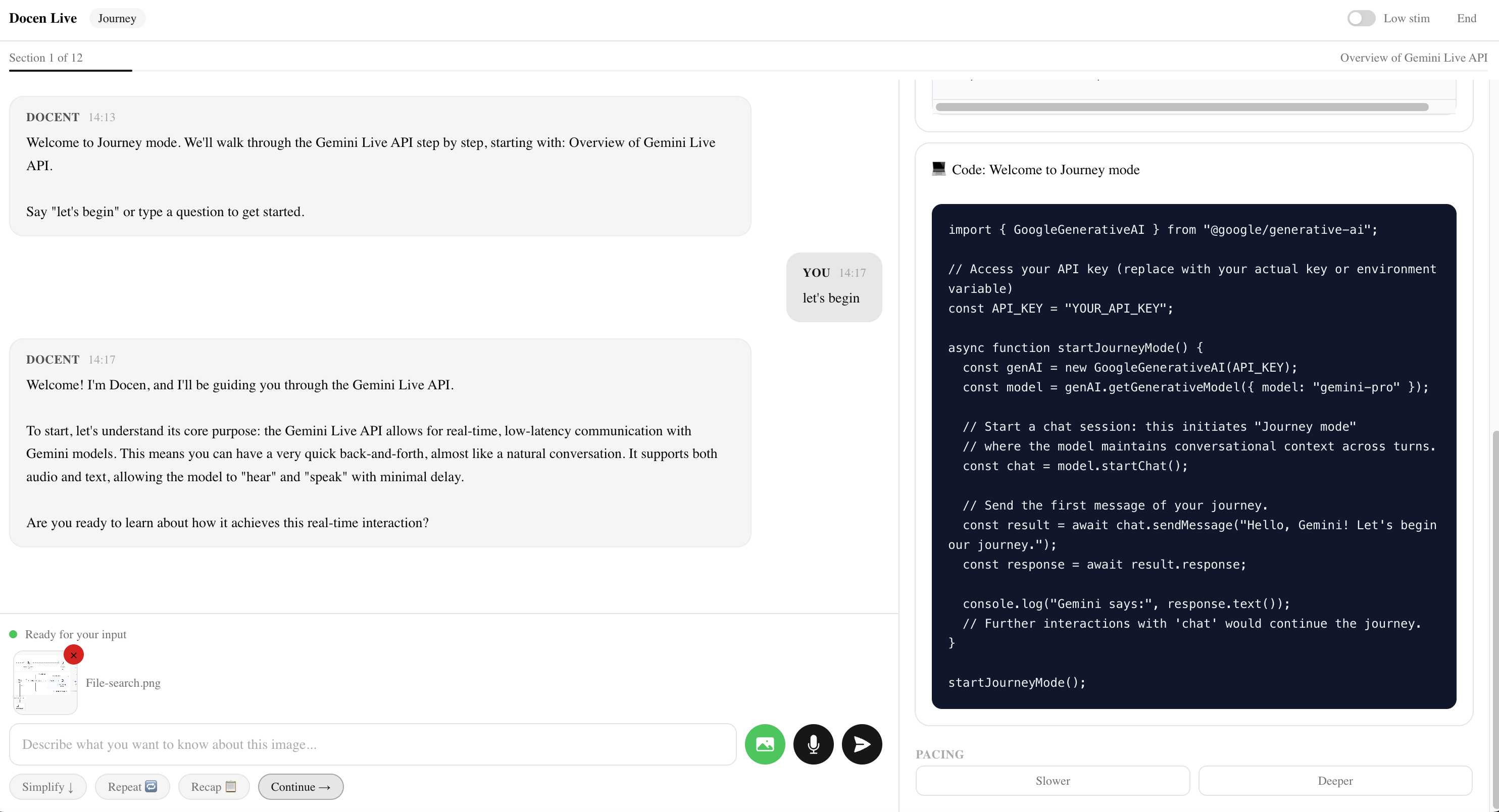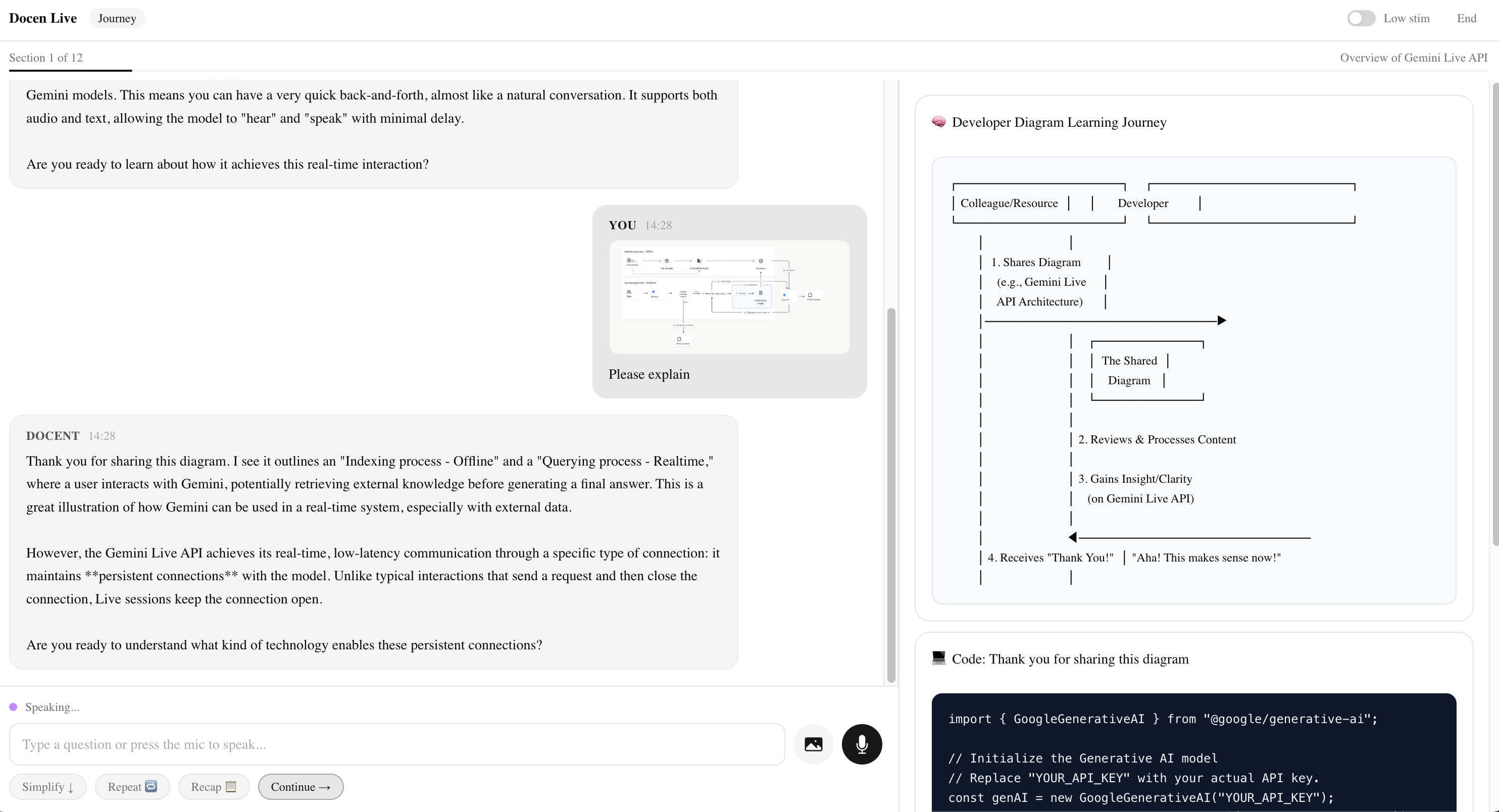 - Upload an image — Click the camera icon → select any screenshot or diagram → type "What does this show?" → send. The docent describes the image and connects it to the lesson. This is bidirectional multimodal input.