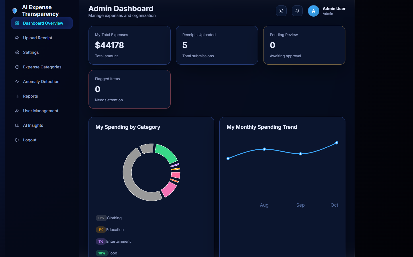 Flowchart of the System: User Uploads Receipt │ ▼ OCR Text Extraction │ ▼ Expense Categorization │ ▼ Fraud Detection Agent │ ▼ Anomaly Detection │ ▼ Audit Summary Agent │ ▼ Final Audit Report