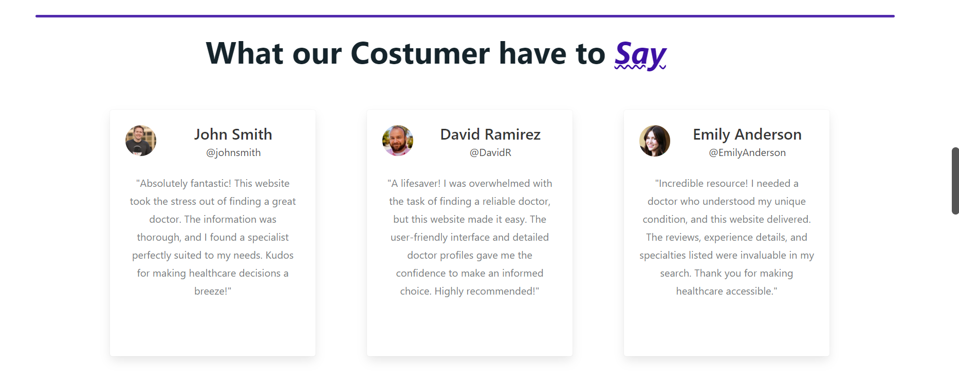 We built this website by combining our passion for healthcare with our technical skills. Using HTML, CSS, and JavaScript, we crafted a user-friendly platform that showcases doctors' profiles, integrates real reviews, and offers a seamless experience. The design prioritizes simplicity and accessibility to ensure that users can easily find and connect with the best doctors for their needs.