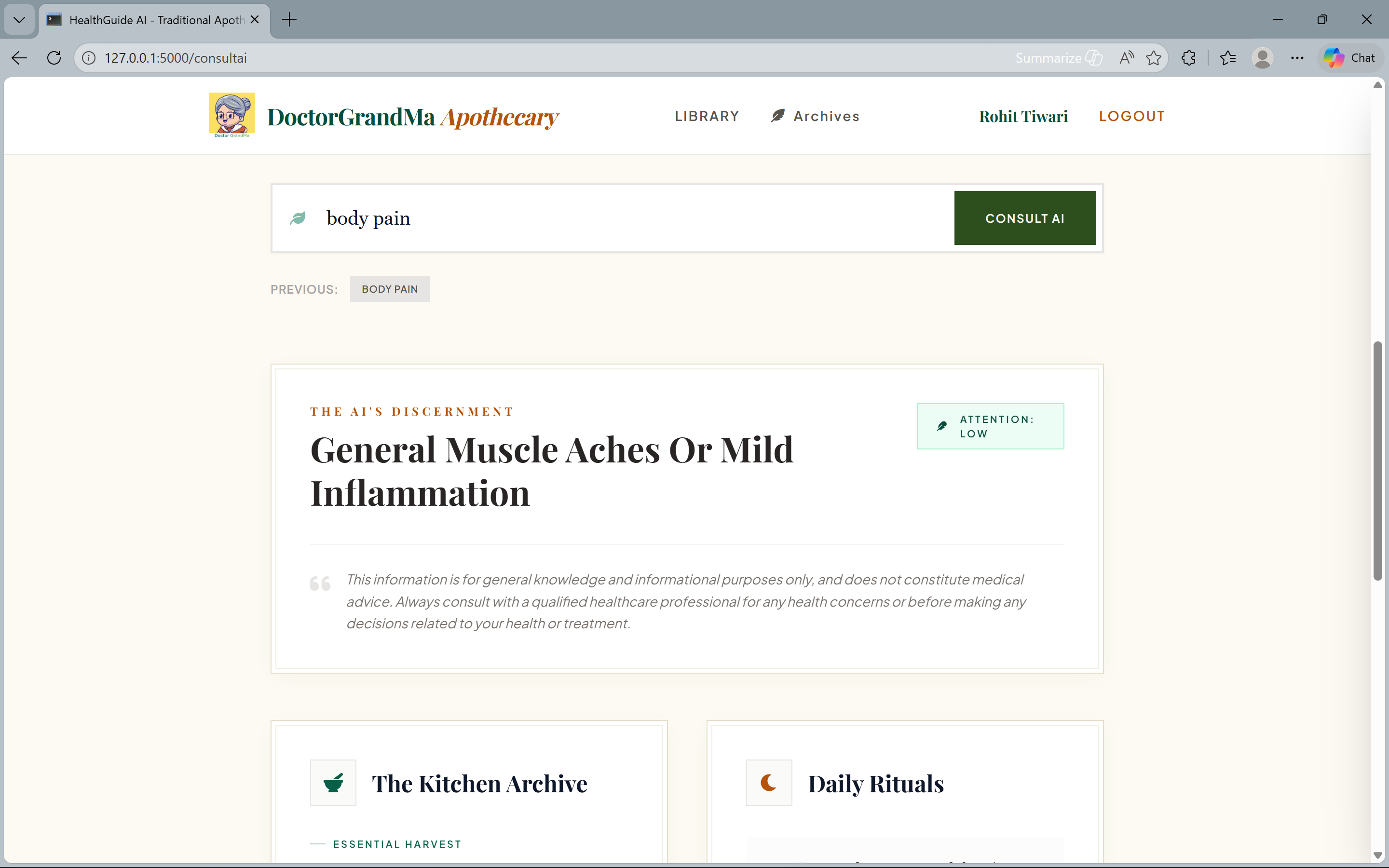 Tuning the "Voice": It was challenging to prompt the AI to stay within the "Doctor Grandma" persona—being helpful and traditional without making dangerous medical claims.