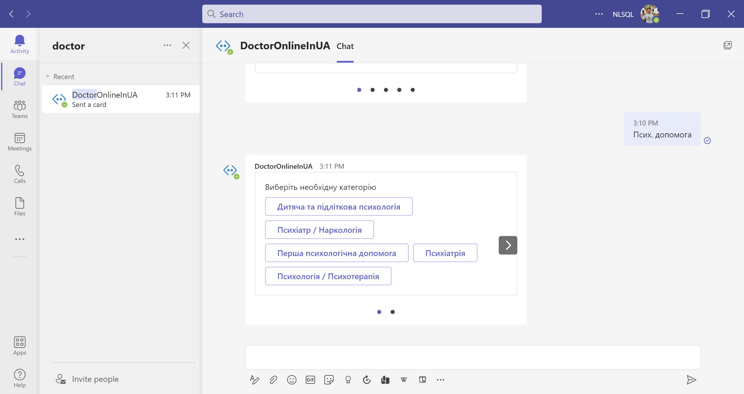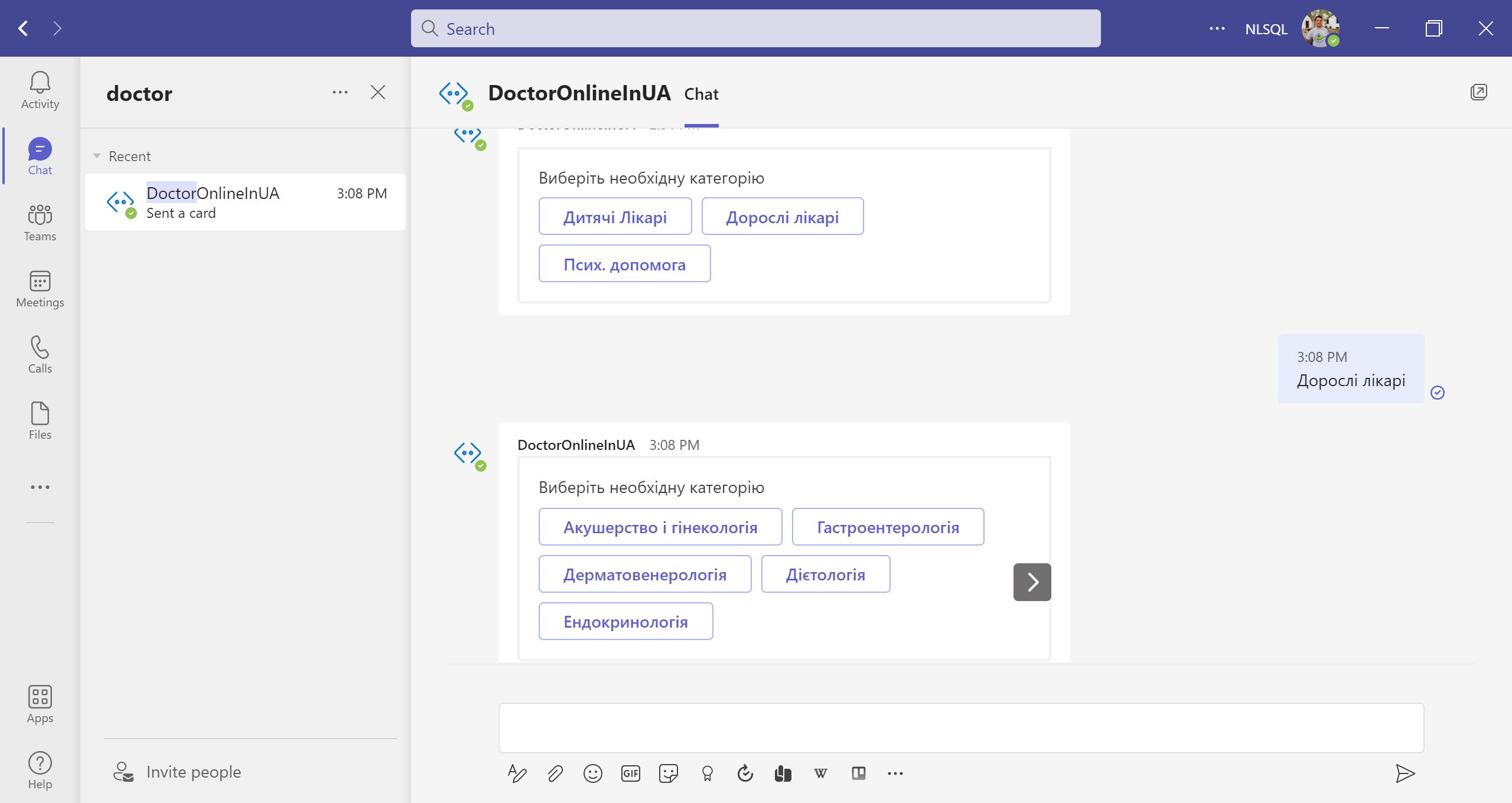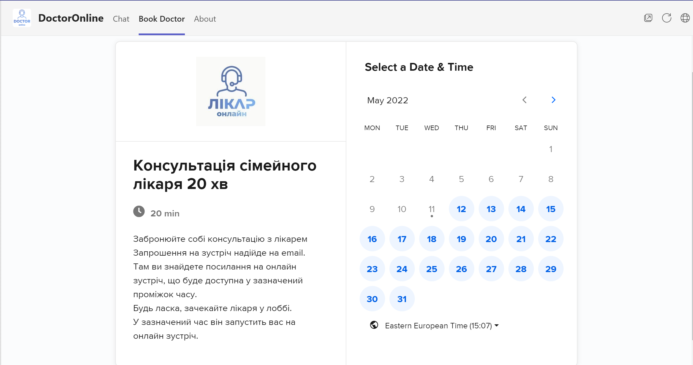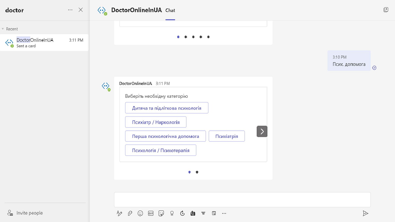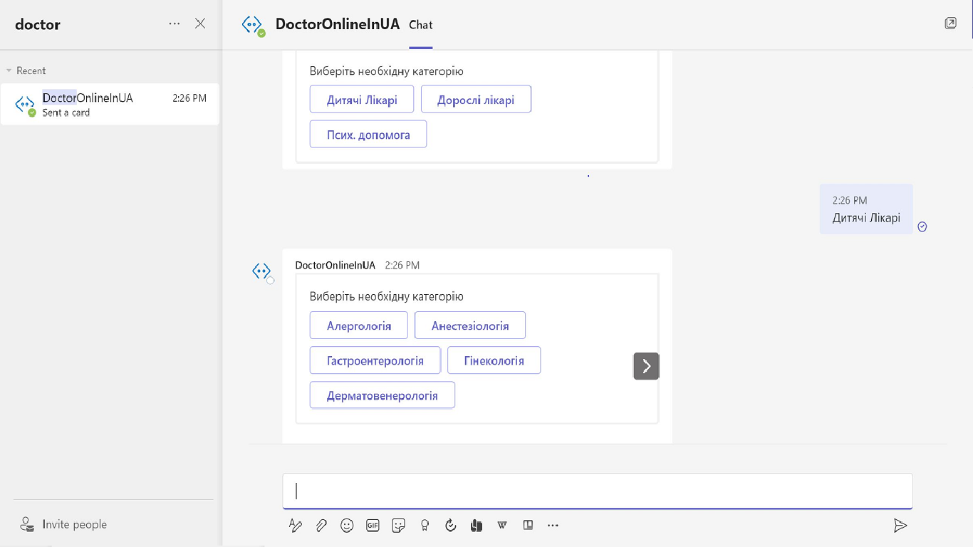 The aim of this project is to help Ukrainian people to get free online healthcare support. Doctor Online is a free service available in Microsoft Teams, Telegram, Meta Messanger and Web interface for an easy booking of required doctors for online consultation.