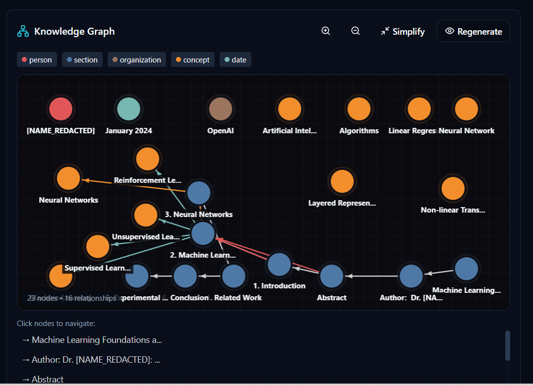 This feature alone separates DocuMorph AI from 90% of PDF converters. Instead of just extracting text, we build an interactive knowledge graph that shows how concepts, sections, and entities in your document relate to each other. Every knowledge graph is generated live using ERNIE AI. Here's actual server logs from a real document processing: