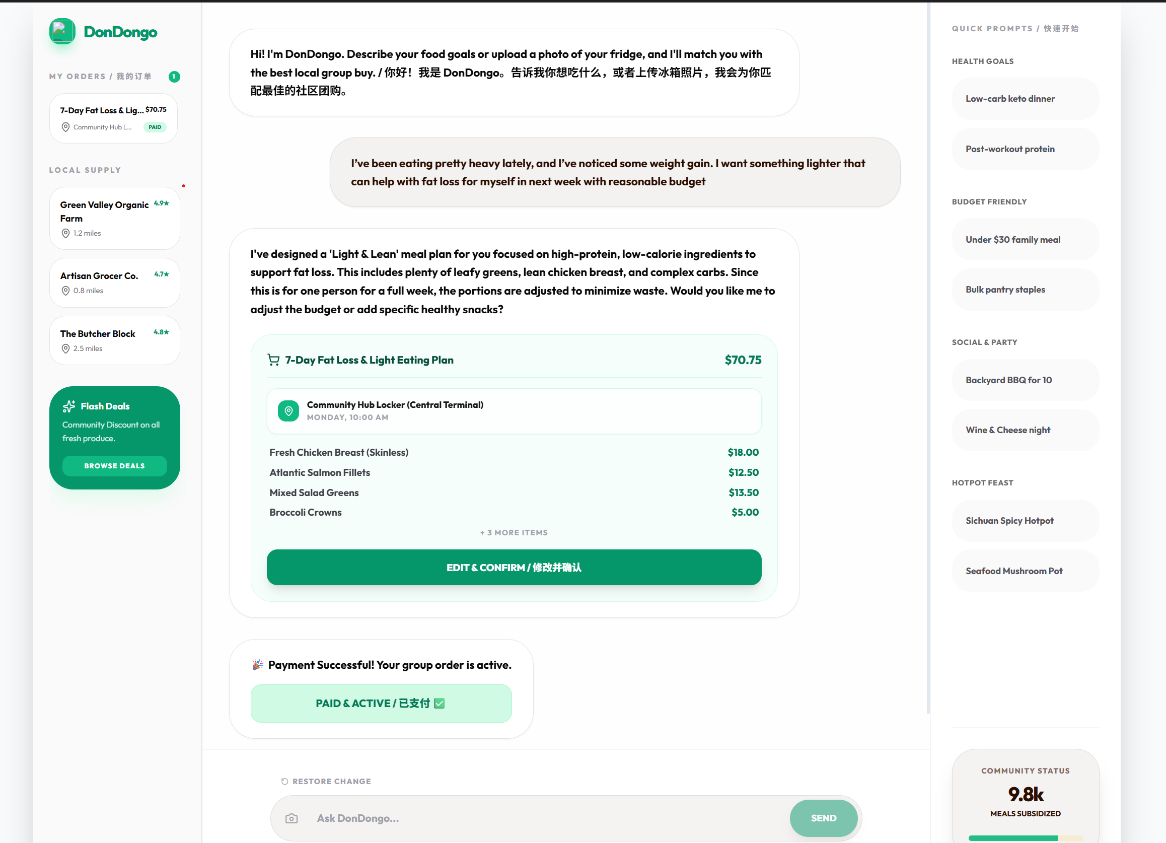 Most food platforms start from products. We start from intent. Users describe what they want to eat in plain language — including preferences, recent eating habits, health goals, or specific dishes. The agent reasons about these inputs, translates them into structured ingredients and meals, matches them with available local merchants, and generates a complete group order.