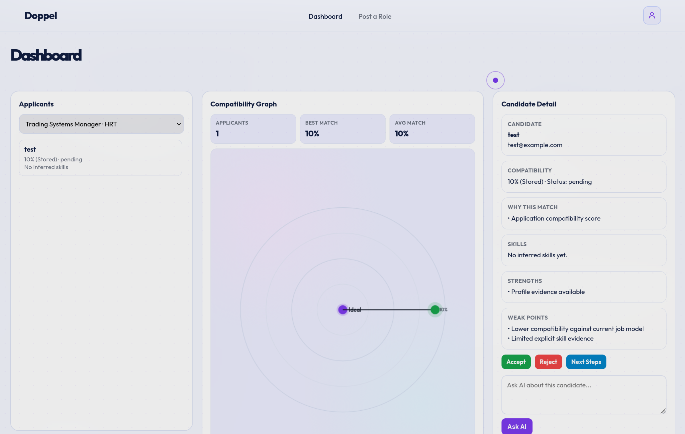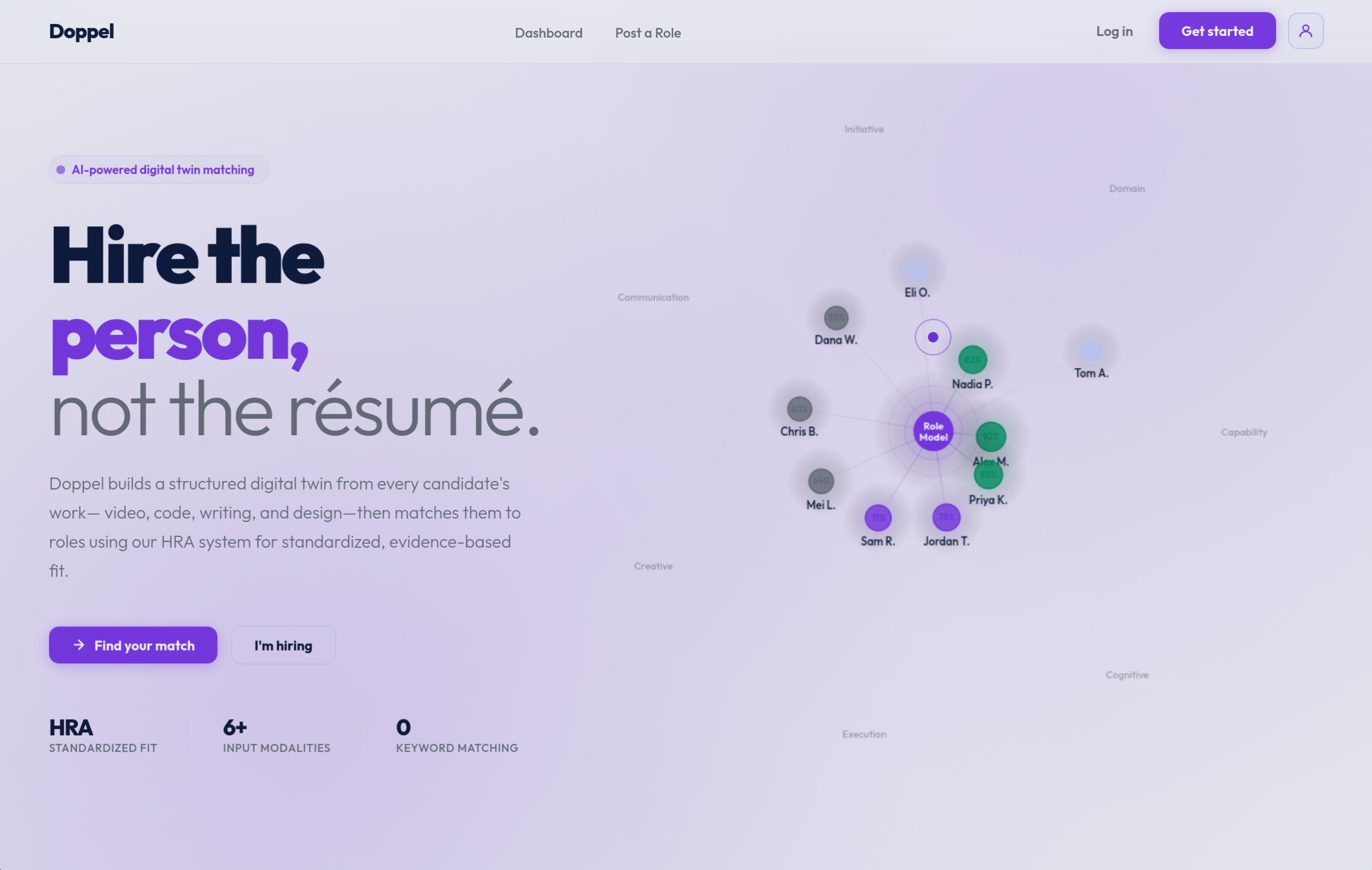 Doppel is an AI hiring platform that replaces the traditional resume-and-keyword-filter process with something fundamentally deeper. Instead of asking candidates to compress their entire career into bullet points, Doppel lets them upload anything - resumes, code, research papers, writing samples, PDFs, project descriptions, and builds a structured digital twin of who they actually are professionally. The AI reads all of it, extracts signals like communication clarity, execution evidence, domain expertise, and initiative, then synthesizes everything into a single unified candidate model. On the employer side, recruiters paste a job description and the system builds a matching structured model of what the role actually requires, not just keywords, but a full profile across seven evaluation dimensions called HRA axes (things like Capability Depth, Execution Reliability, and Cognitive Approach). These scores are intentionally hidden from candidates so no one can game the system. Matching then happens in two layers: semantic similarity via OpenAI embeddings, and Euclidean distance across all seven HRA axes. The result shows up as an interactive graph where candidates are plotted as colored dots around a central job anchor — proximity equals fit. Recruiters can lasso clusters, click candidates to see their full twin profile, and ask the AI natural language questions like "who shows the most initiative?" or "who are your strongest communicators? The core idea is that both candidates and employers are bad at articulating what they want until they see it. Doppel gives them infinite interview depth without the time constraints or bias of in-person screening, matching on demonstrated capability rather than polished presentation.
