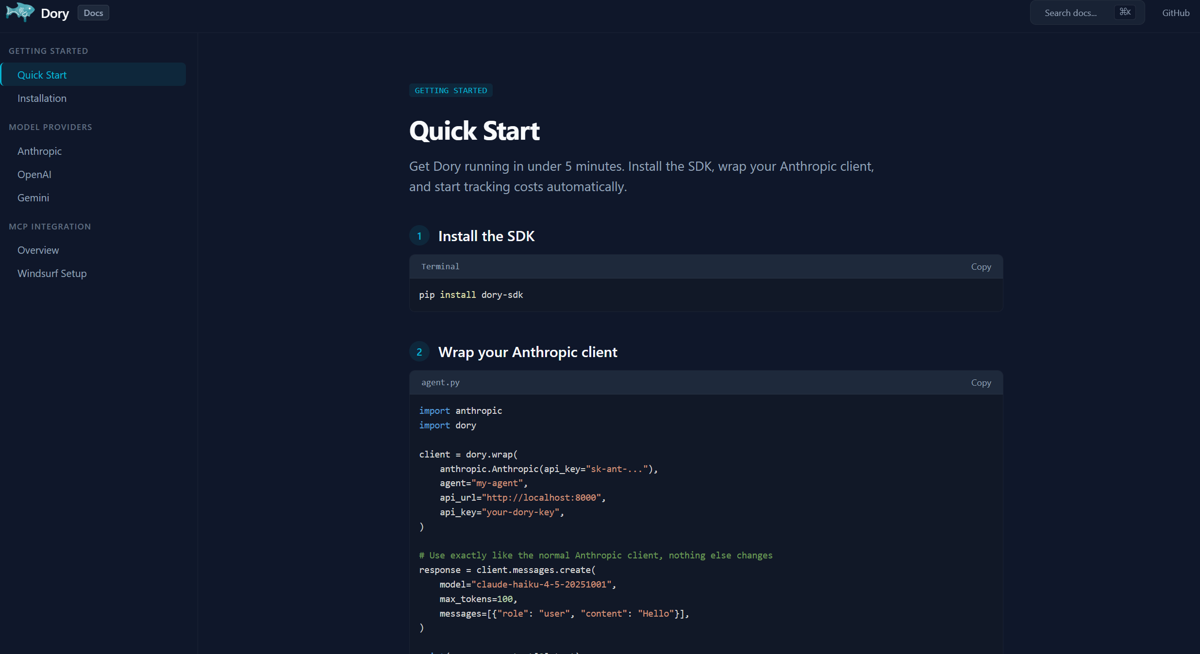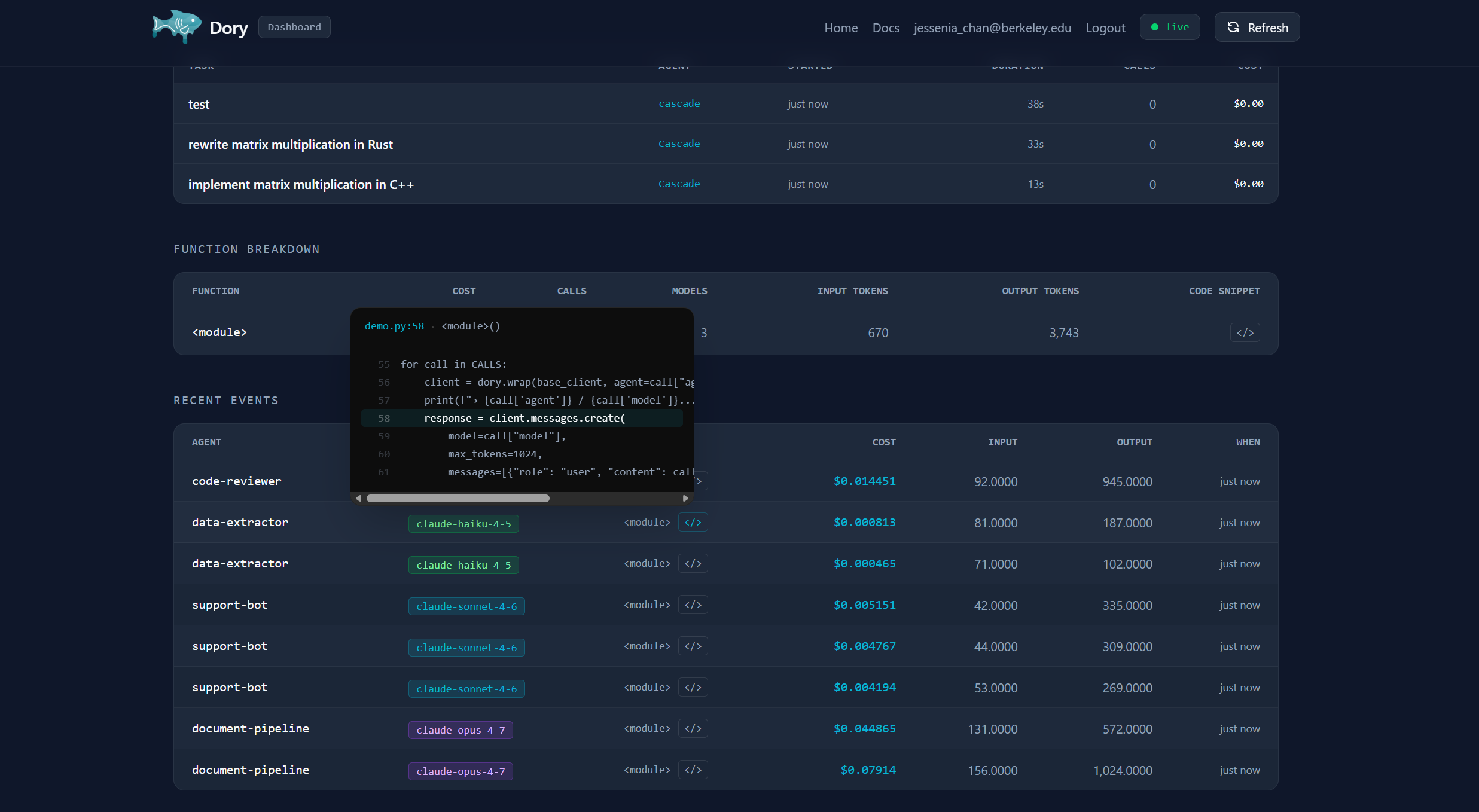 SDK — Python proxy pattern. dory.wrap() returns a thin wrapper around your existing client that intercepts calls, reads token usage from the response, looks up cost from a pricing table, captures the call site via inspect, and fires the event to the backend asynchronously. Zero changes to downstream code.