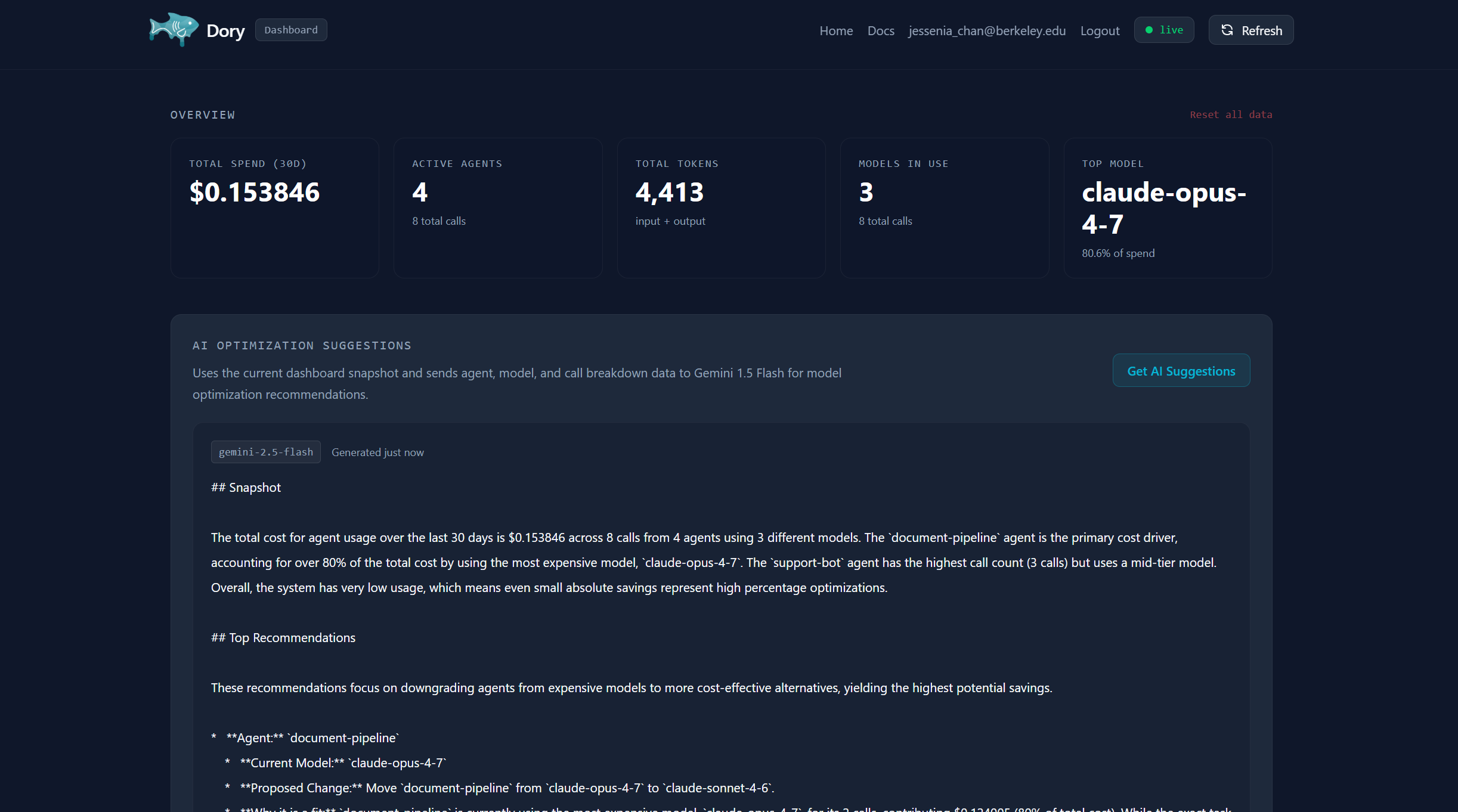 The SDK wraps your existing LLM client to intercept and record token usage on every call, surfacing that data instantly on the dashboard. The dashboard then shows all of the costs broken down by several categories those being the agent, model, and function, with a time-series trend as well as a per-task tracker. This dashboard also covers AI-powered optimization suggestions from Gemini. We include no polling, and the UI updates via the utilization of MongoDB change streams over SSE the moment a call lands.