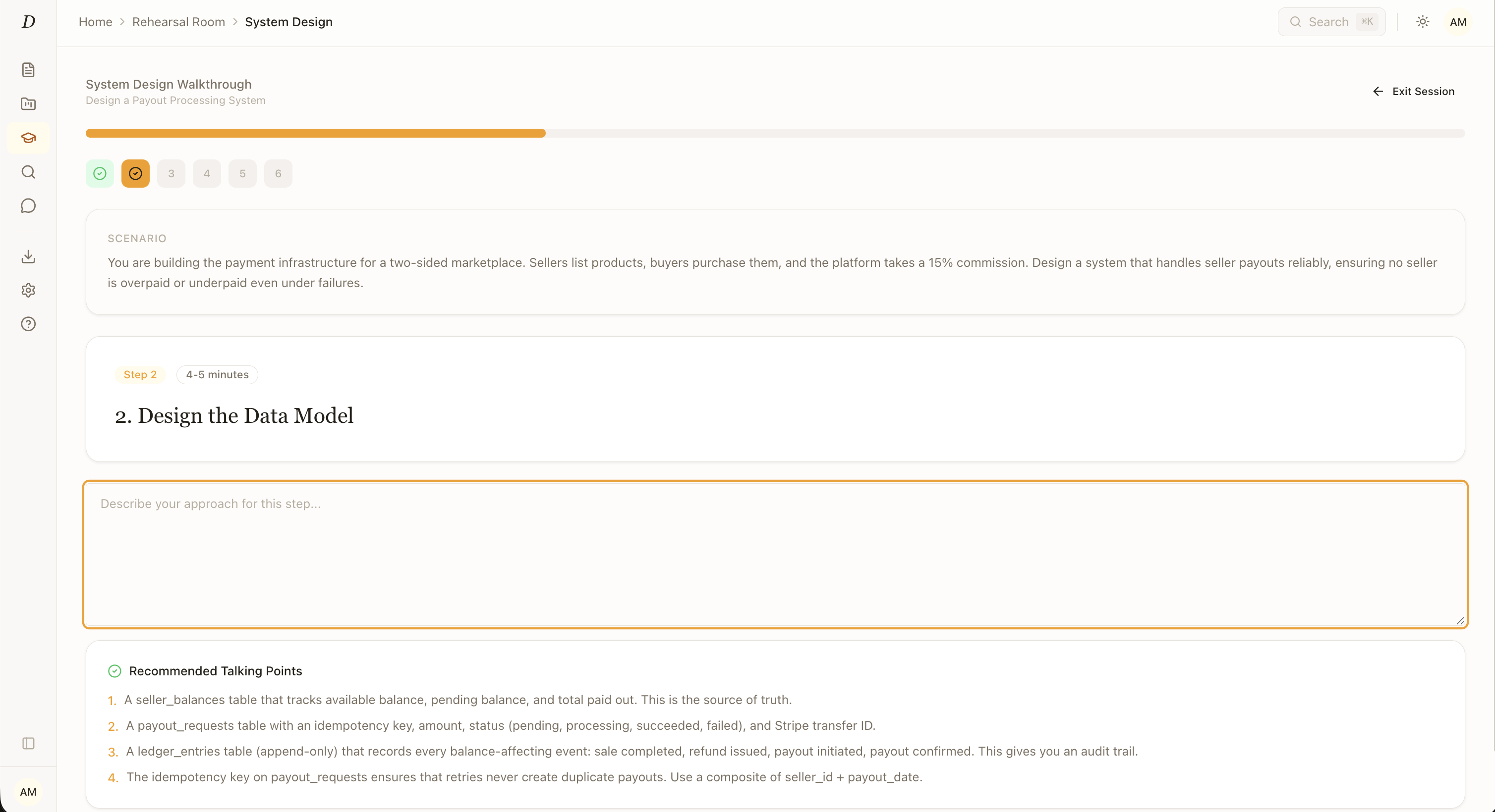 - Scope to the core wedge: the "project story + proof + practice" loop (pitch → deep dive → system design pivots → rapid-fire) before expanding feature breadth.