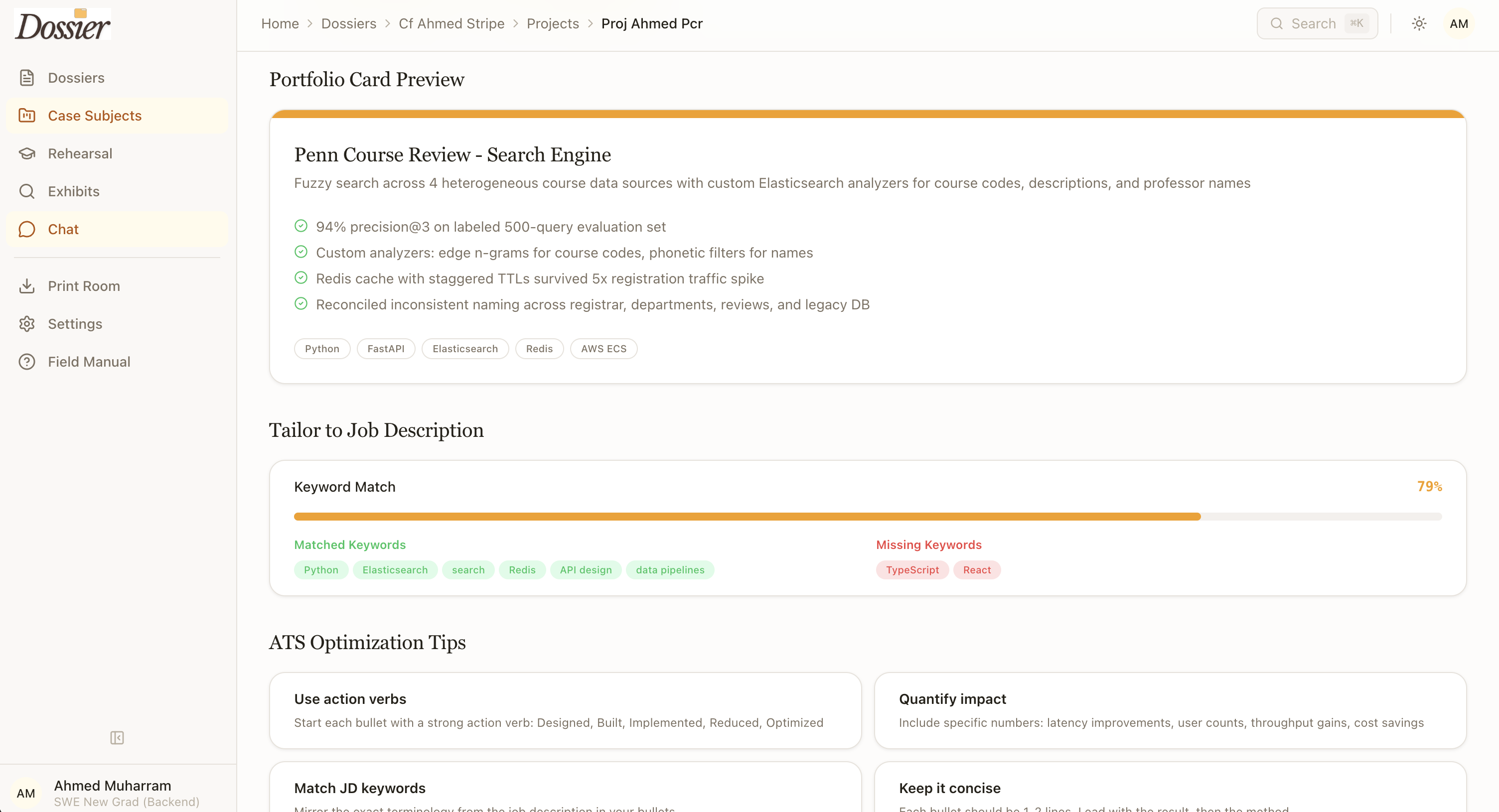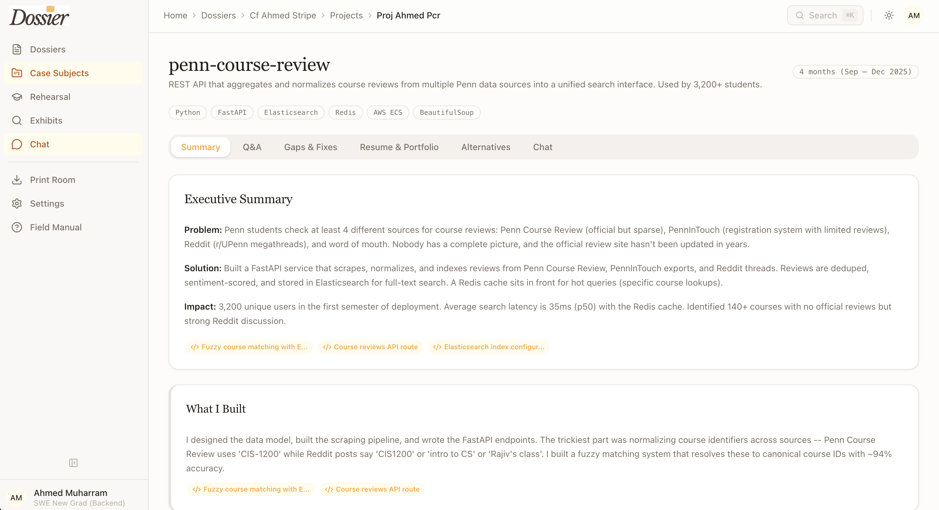 Dossier started from a simple question: what if your projects came with a reusable, backed-by-code "case file" you could review before every round, so you never have to re-index your own work under pressure?