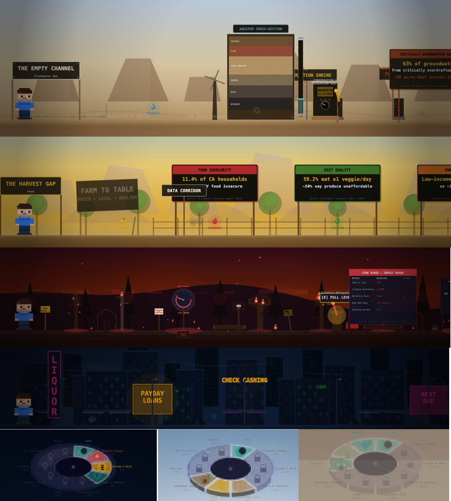 Healing the Doughnut: Inside each level, players encounter evidence boards that surface real California statistics, and lever gates, which are decision points where you choose between policy options. Pull a lever, and the sector's severity actually decreases. Return to the main menu and watch the doughnut's red wedges shrink, replaced by green, a visual record of the healing you've done. Progress persists across sessions.