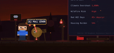 Data visualization doesn't have to be passive. When you let people inhabit the data, walk through a level themed around California's housing crisis, pull a lever that represents a real policy, and watch the doughnut heal, the numbers stop being abstract. 65% housing cost burden becomes a world you've been in.