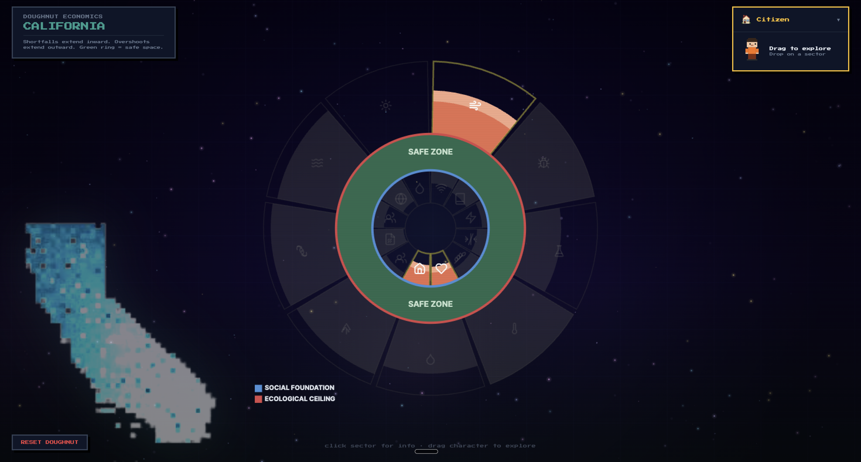 We also learned that doughnut economics is a powerful storytelling framework. The dual-ring structure naturally creates tension (shortfall vs. overshoot) and a clear goal (find the green). It's the rare economic model that's also good game design.