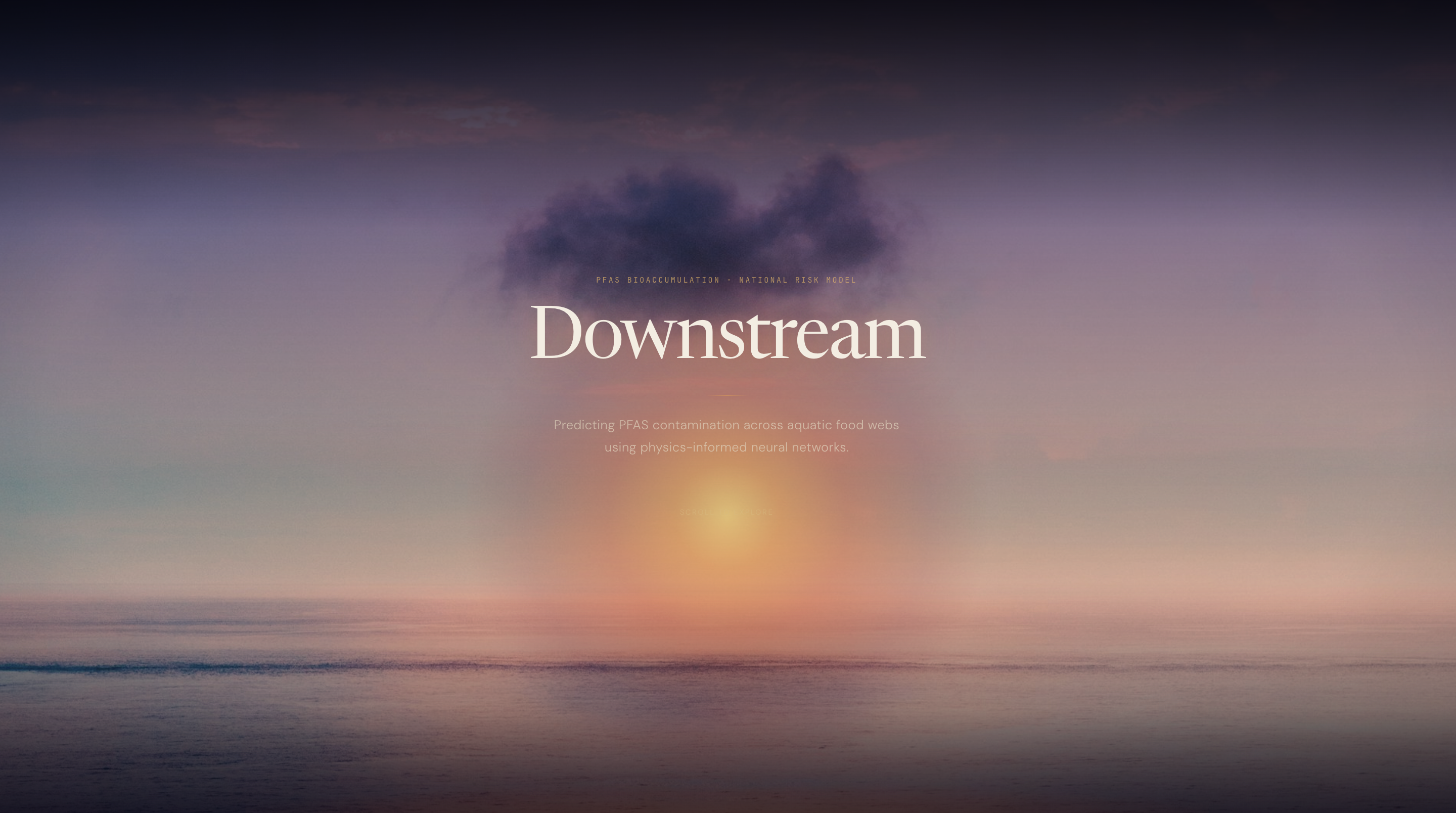 Downstream traces PFAS from factory discharge to predicted fish tissue contamination to personalized human exposure risk, visualized on an interactive map of the continental United States.