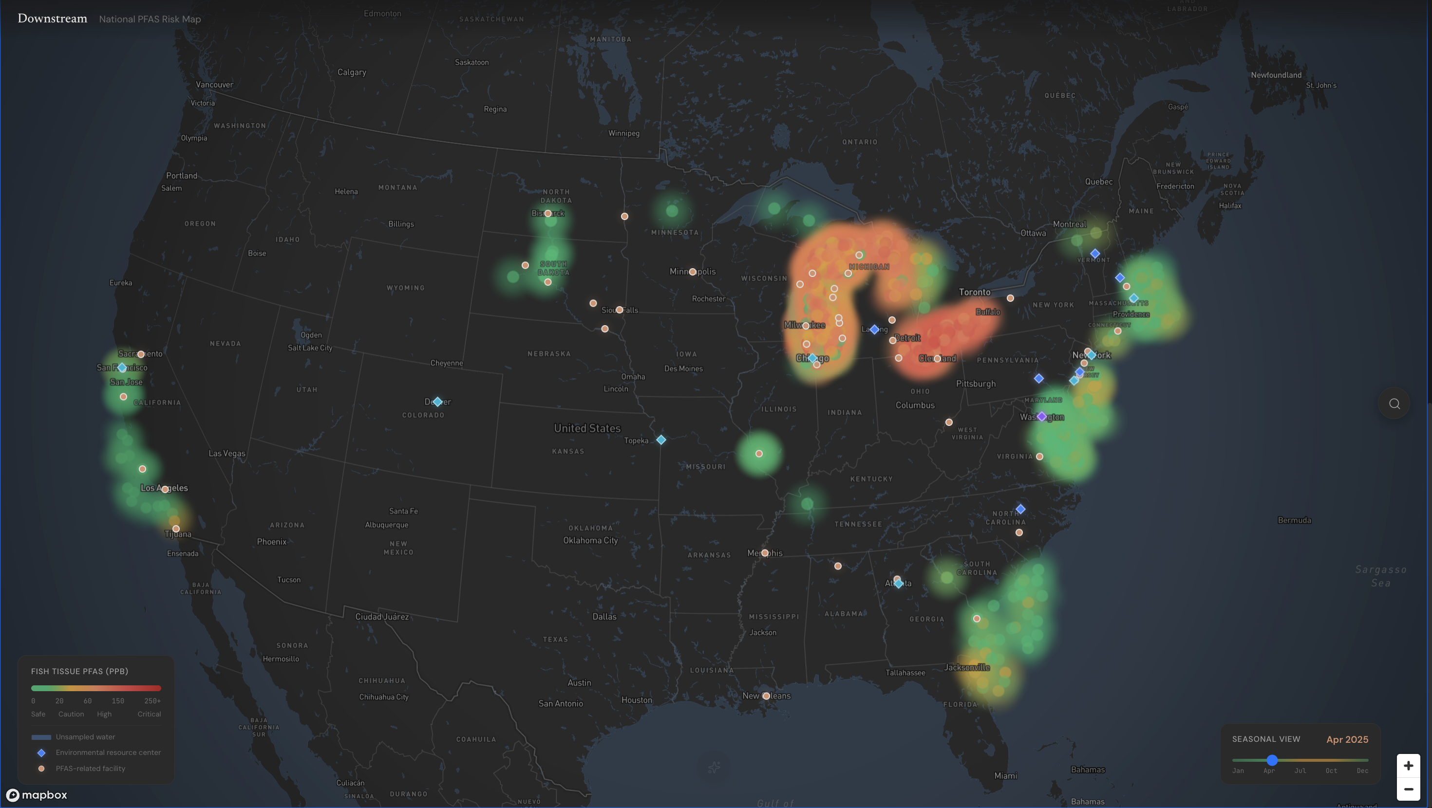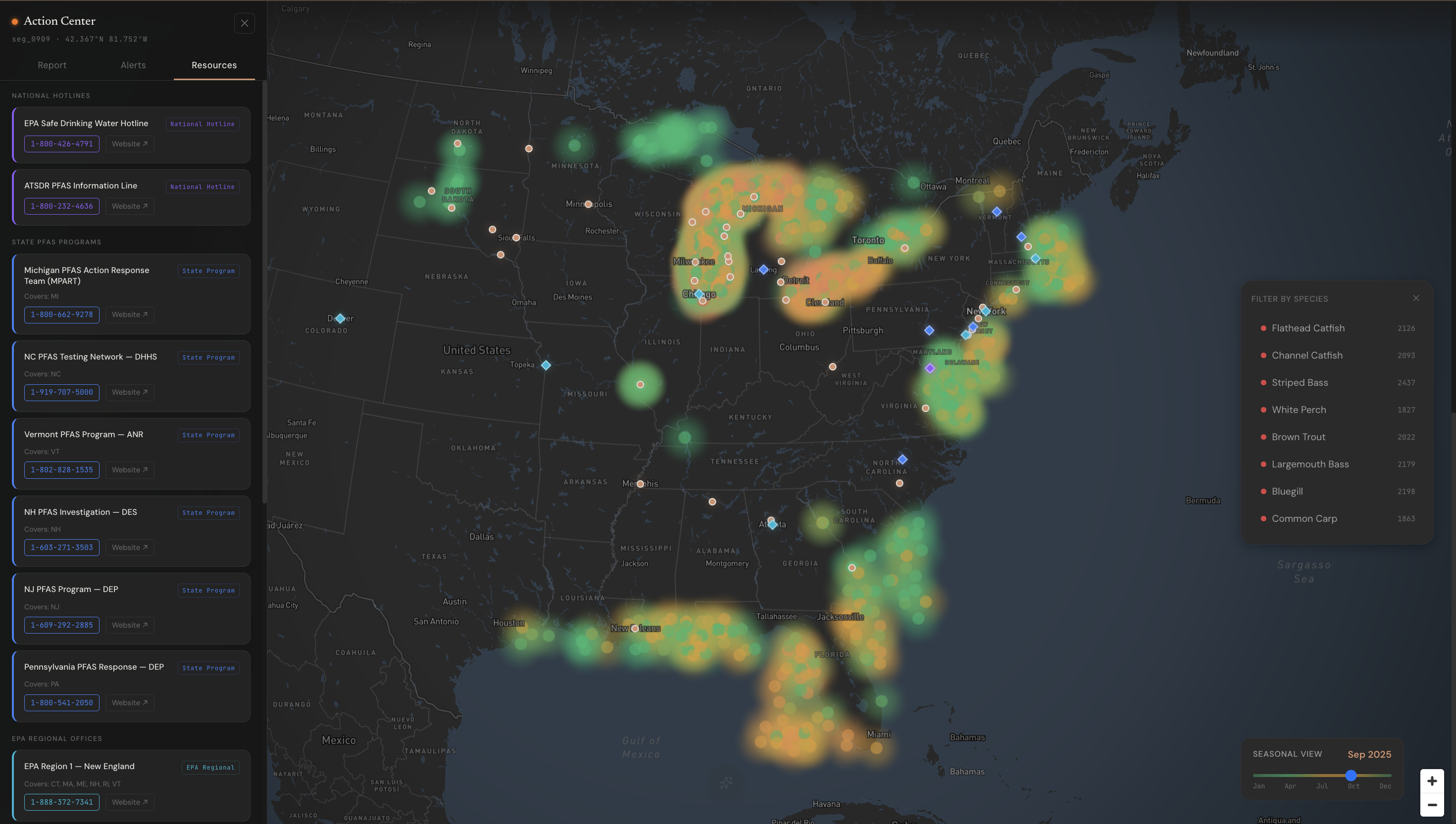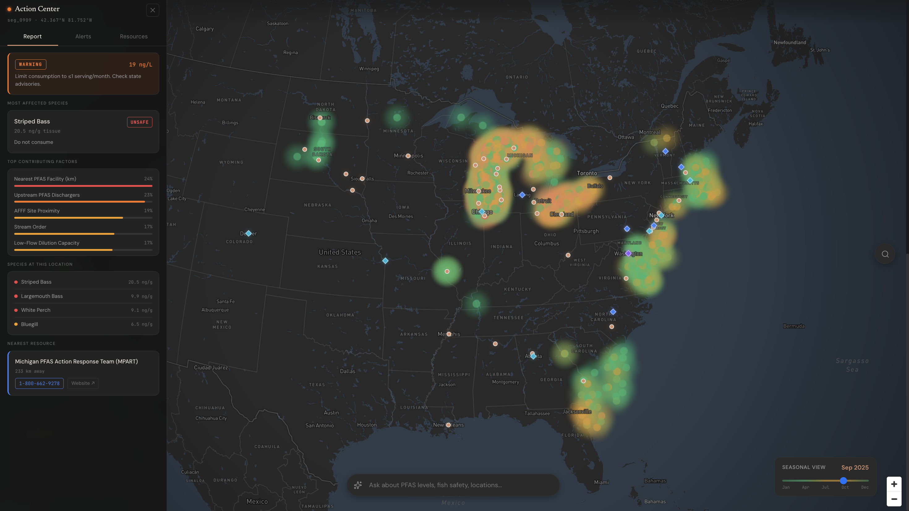 - A seasonal slider showing monthly contamination shifts, including the documented decline in Great Lakes fish tissue PFAS over the past year