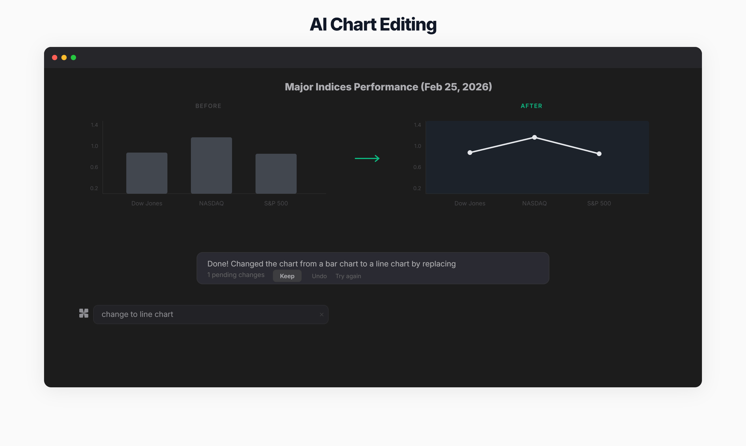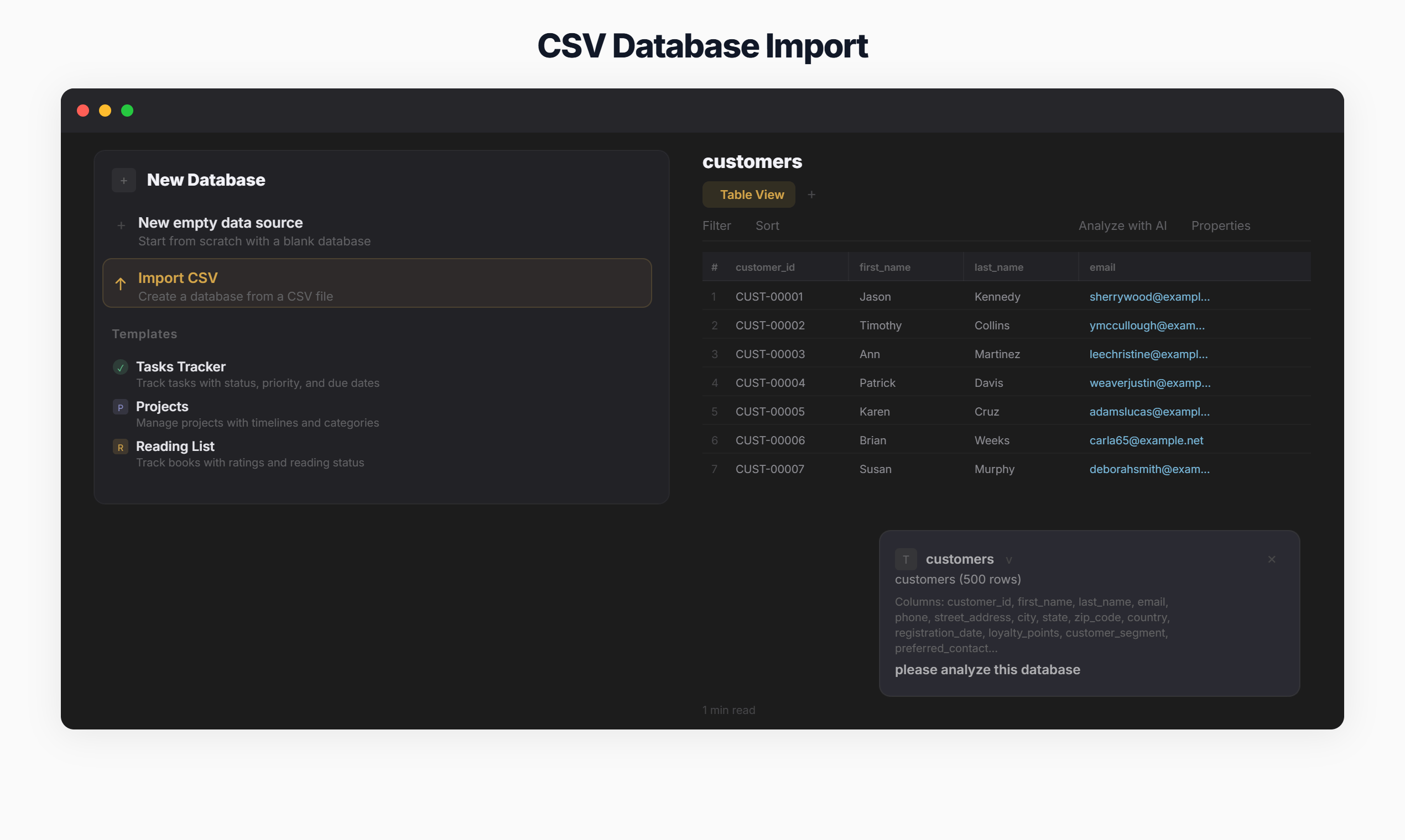 - CSV Import & AI Analysis: Drop a CSV file and get instant AI-powered charts and data insights