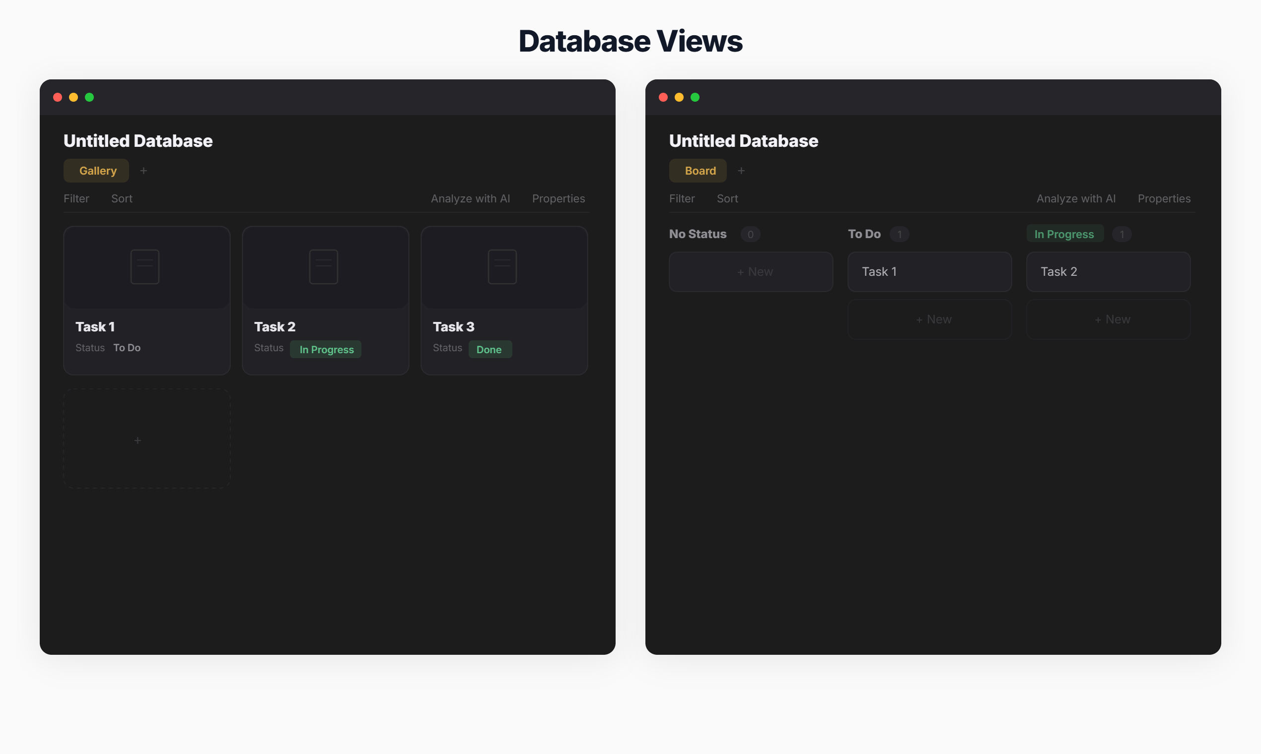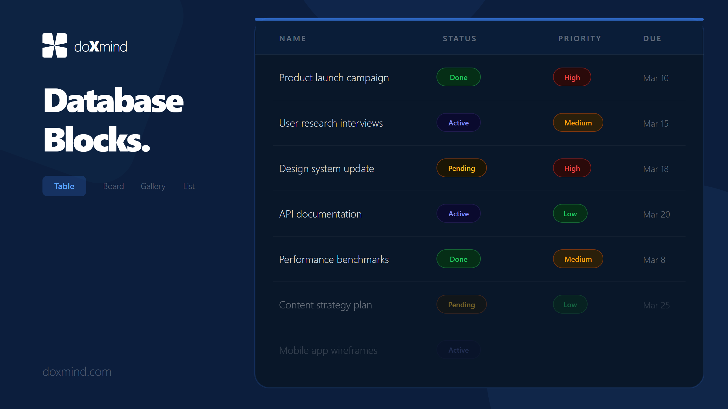 - Database Blocks: Notion-style structured data with table, board, gallery, and list views — right inside your documents