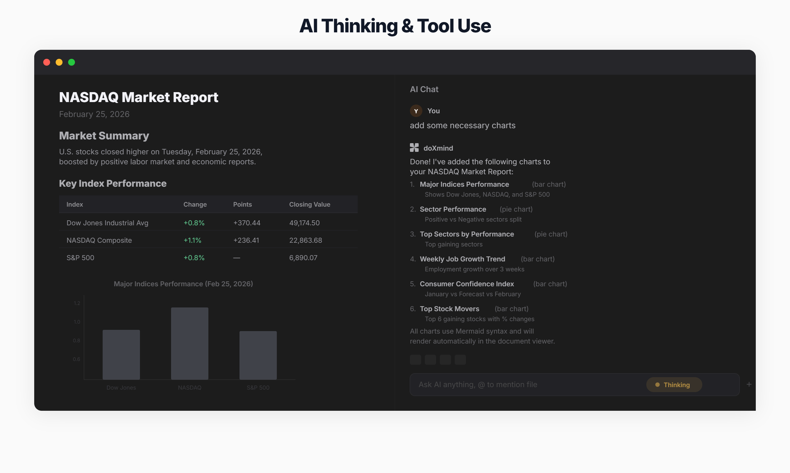 - AI Thinking Mode: Watch the AI reason step-by-step with visible chain-of-thought before answering complex questions