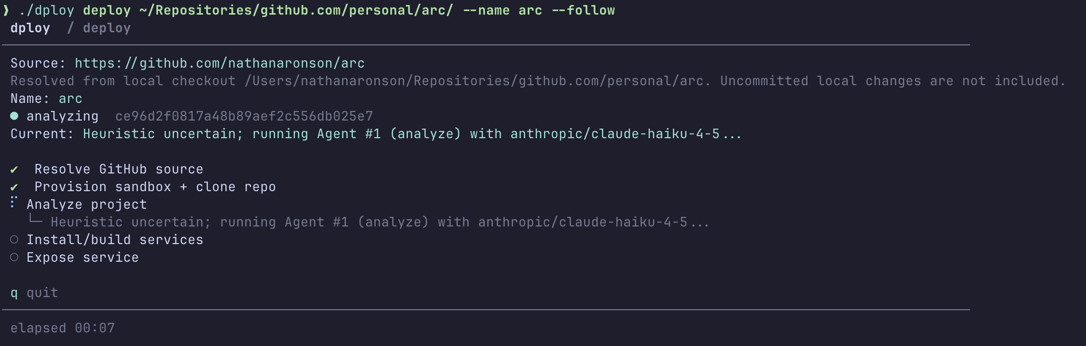 Point dploy at a GitHub repo and it provisions an ephemeral sandbox, figures out how the project runs, and returns a public URL. Web apps get an HTTPS link, CLI tools get a shareable browser terminal, and monorepos get per-service URLs.