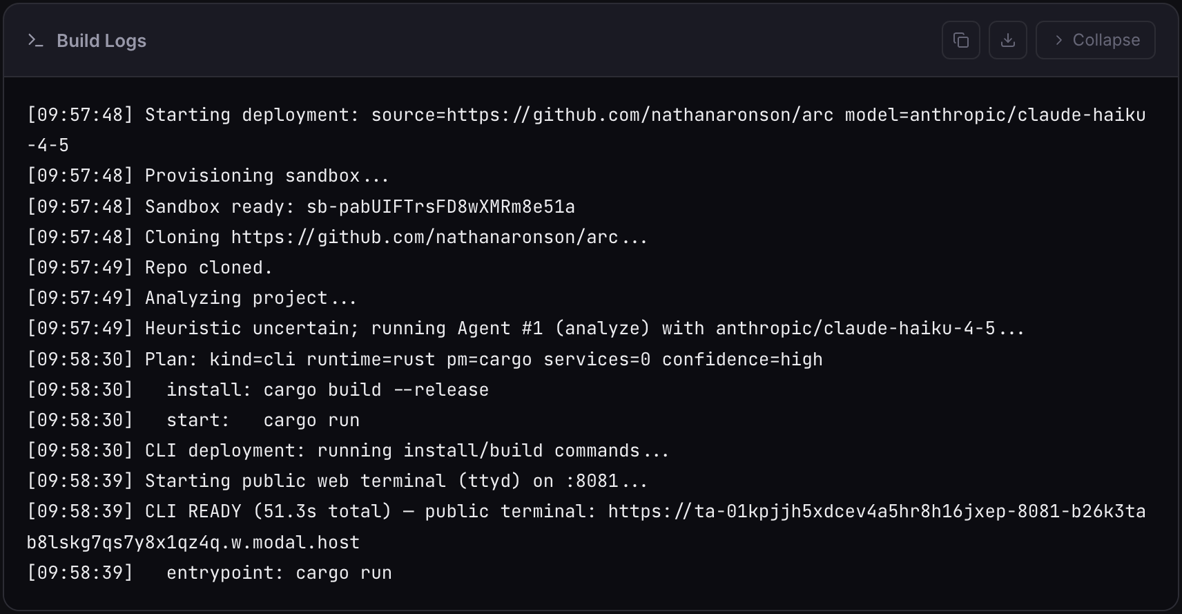 Speed by design. A warm sandbox pool eliminates cold-start latency. Heuristics cut most LLM round-trips. The result is a typical repo going from request to running in a couple of minutes.