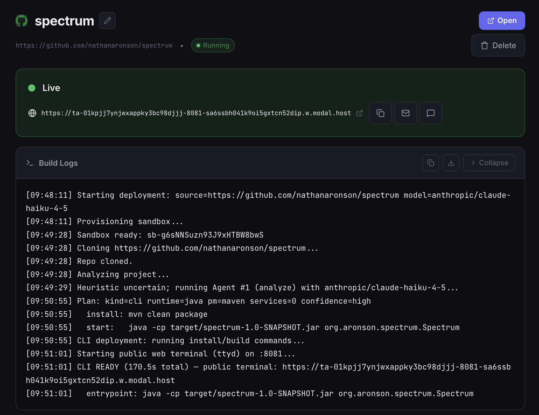 Agents for the rest. When the layout is ambiguous, Agent #1 inspects the codebase and produces a structured plan. Agent #2 runs install and build, starts the server, discovers the actual bound port, verifies HTTP, and reports back. Both agents run inside the sandbox where the code already lives.