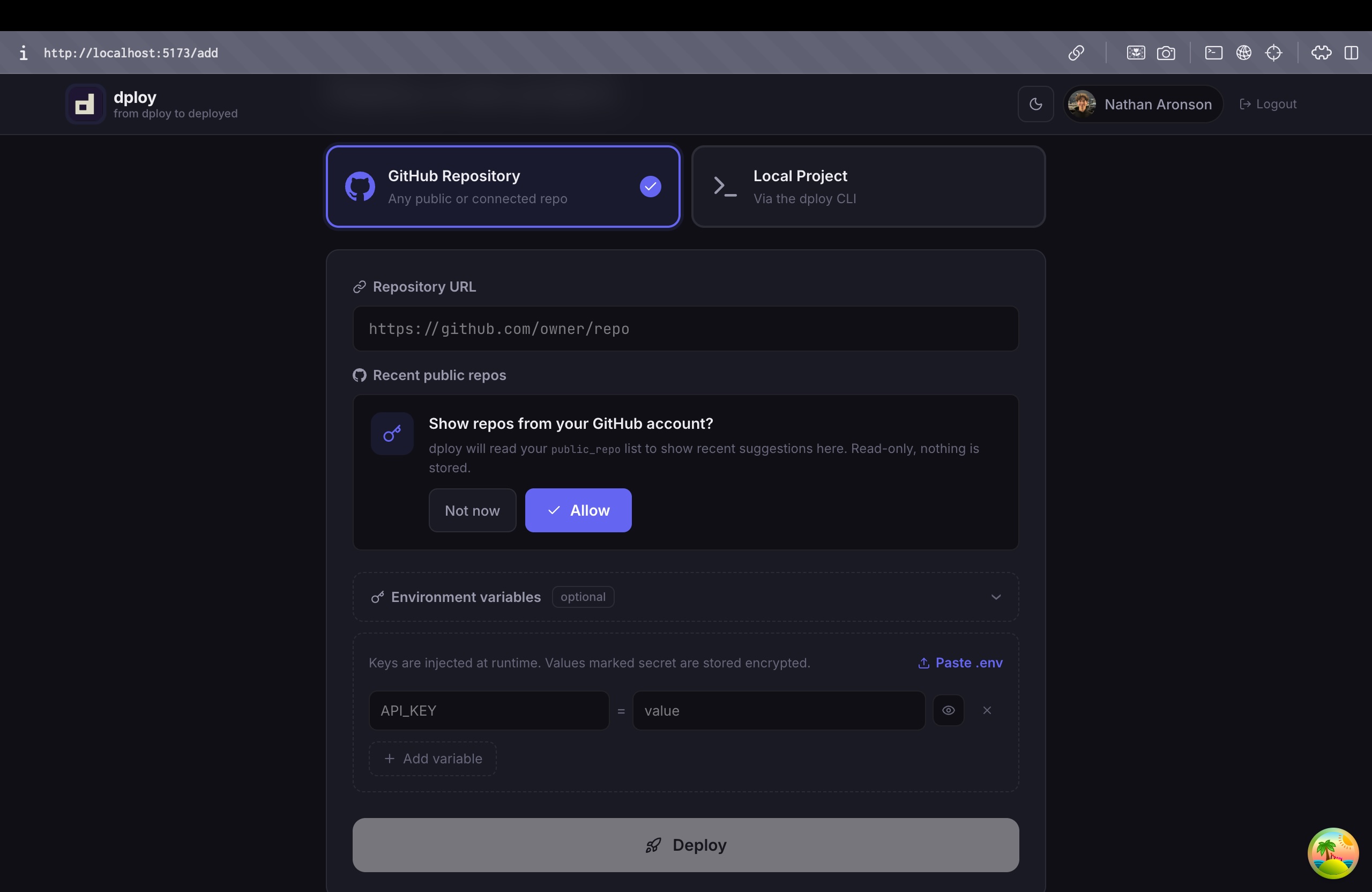 And platforms like Vercel and Railway solve this, but only for specific frameworks; they're fast because they already know what you're building. That breaks down for solo developers and small teams working with Flask, Go binaries, Streamlit apps, CLI tools, or monorepos. dploy is the thing you reach for when you just want to share what you built: paste a repo URL and get a live link within minutes.