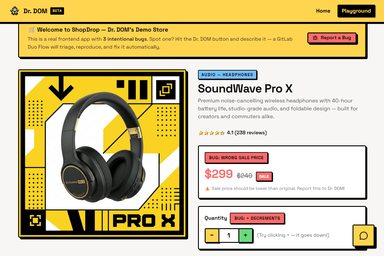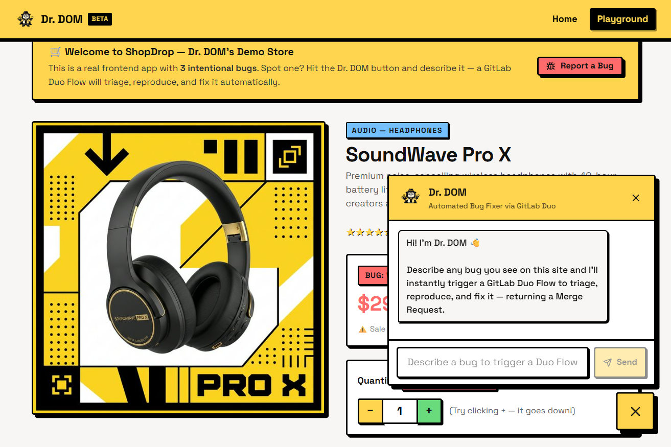 When a user reports an issue via the floating chat widget on our demo app, Dr. DOM creates a GitLab Issue. This triggers a GitLab Duo Flow that spins up a series of specialized AI agents. In sequence, they triage the bug, write a Playwright test to reproduce it, generate a code patch to fix it, and re-test to confirm the fix. Finally, it creates a Merge Request enriched with test reports, screenshots, and visual video recordings of the fix.