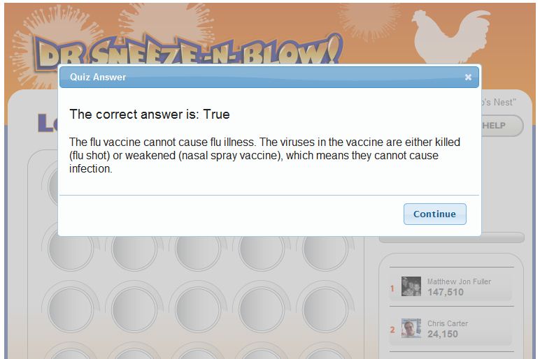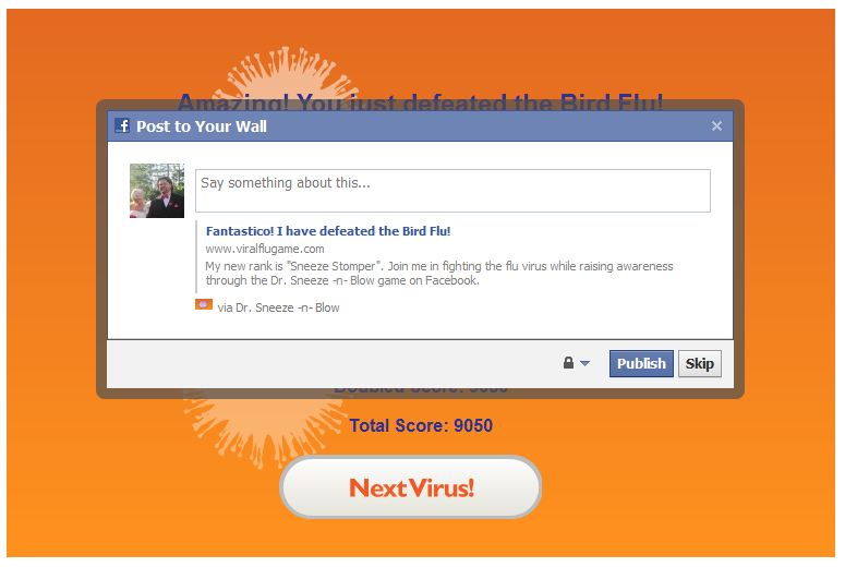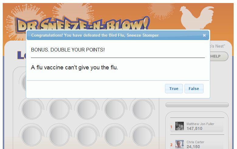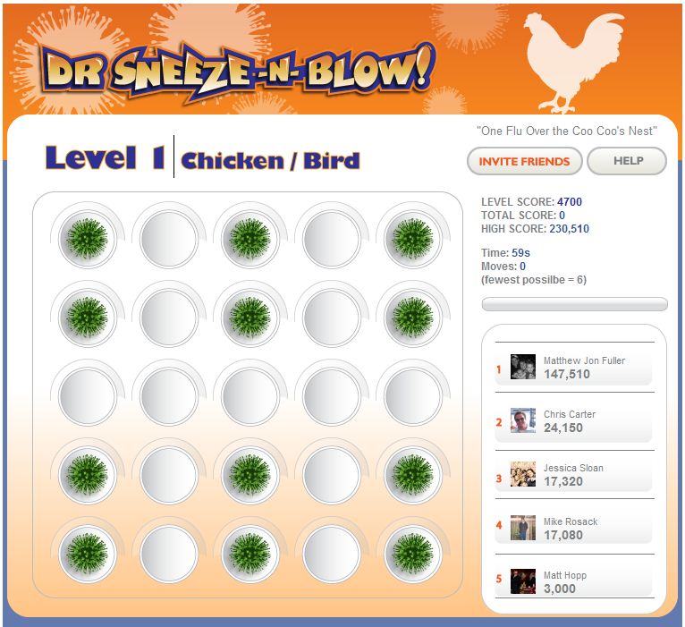 DR SNEEZE -N- BLOW is a socially integrated game developed to help spread educational material about the influenza virus in a fun interactive game environment. The game encourages users to clear each board of the virus and compete against their Facebook friends for higher scores. At the end of each board the player is asked a question about the influenza virus from the CDC's Flu IQ set of questions. Answering the question correctly will double the players score on their way to outscoring their friends. At the end of each level a player is given a new rank like Runny Nose Ninja Warrior or Kung Flu Champion and they can share on their Facebook wall about their successes while challenging their friends to join in on the fun. We had always wanted to make the zombie flu the final level to help spread the game faster through the internet but scratched it thinking the CDC would not approve. Man, were we excited about the CDC's recent embrace and success with their posting about surviving a zombie apocalypse. We quickly integrated in an 11th bonus Zombie Flu round with new rank and title along with a link back to the CDC's Zombie apocalypse posting.