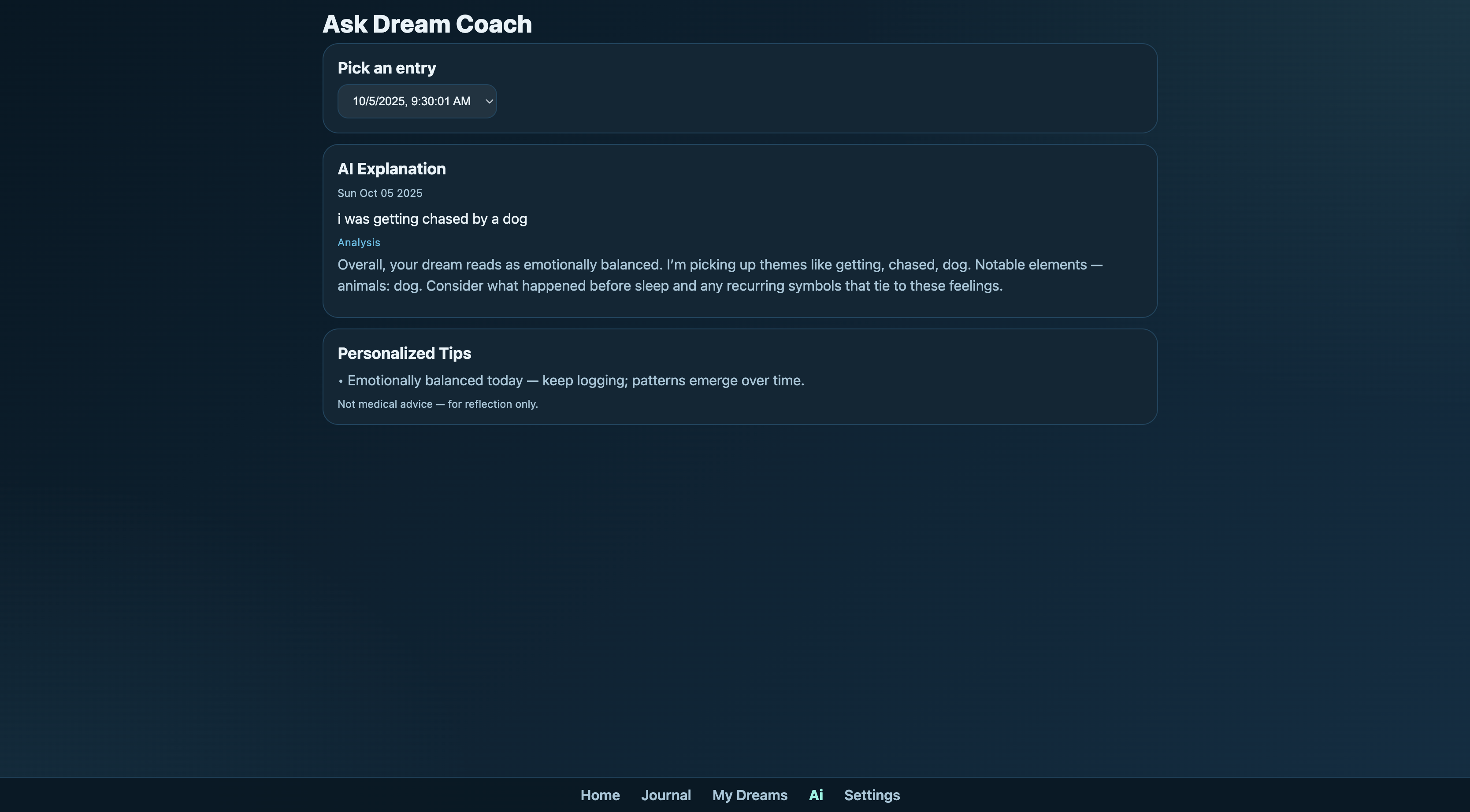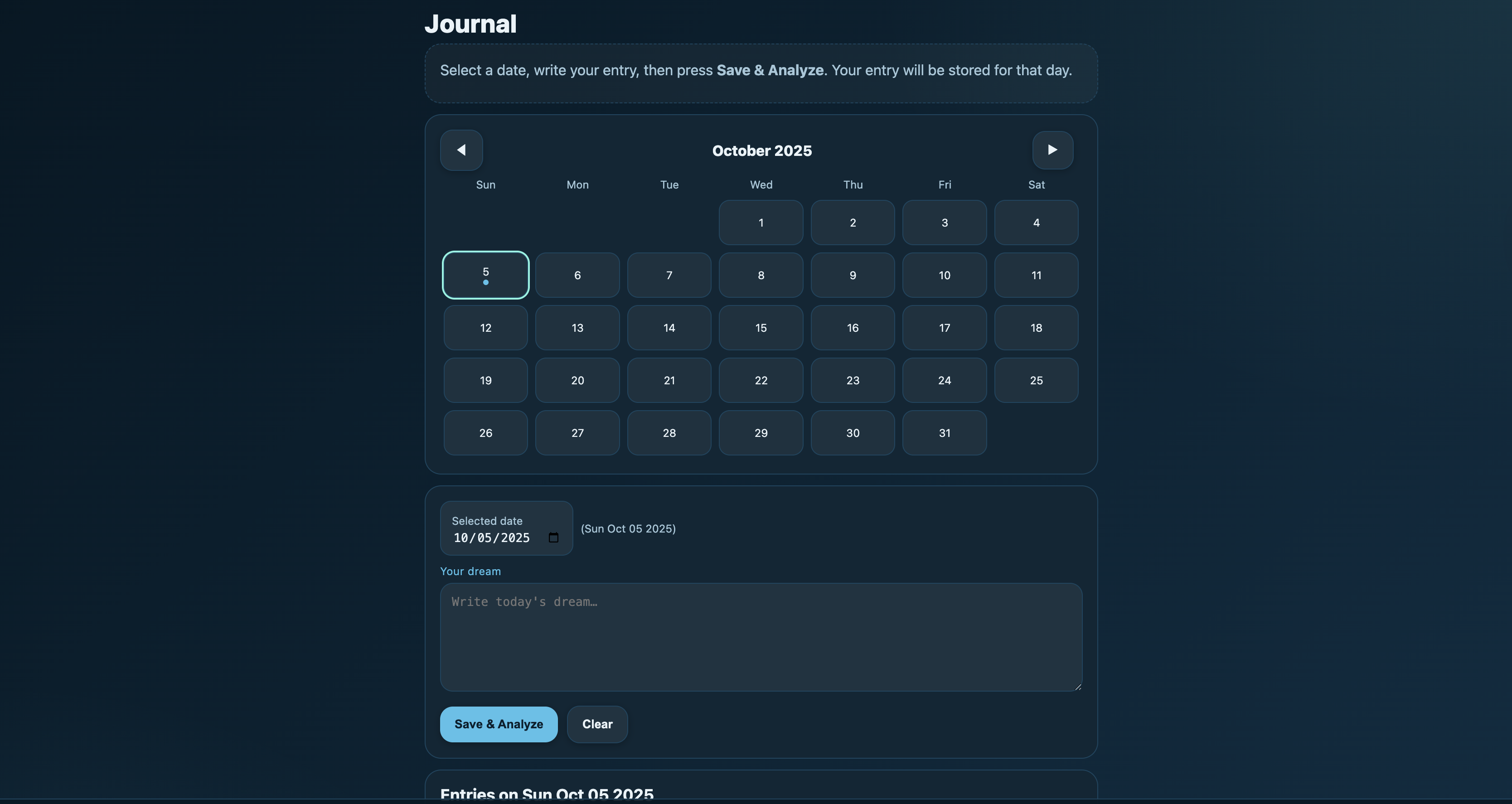 Dream Sea lets you pick a date on a built-in calendar, write your dream, and tap Save & Analyze. An AI writes one clear, empathetic paragraph that highlights themes, emotions, symbols, and possible real-life links, ending with a reflective question. Entries live in My Dreams, stay private in your browser, and are easy to export.