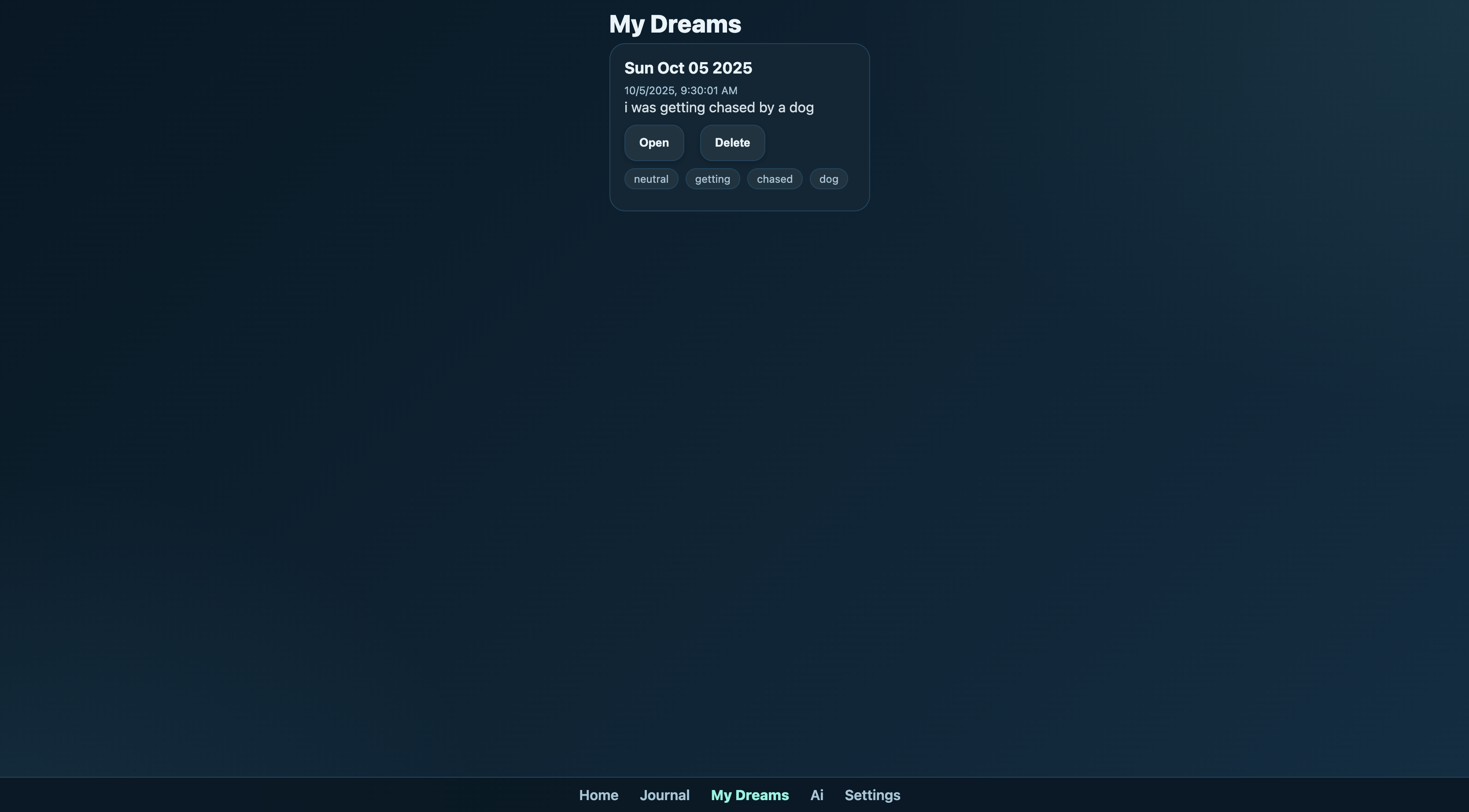 Dreams fade fast, and a paper journal wasn’t there when we needed it most—on the bus, between classes, right after waking. We wanted something calm and accessible that makes it easy to capture a dream in the moment and come back later to find meaning. That became Dream Sea: a web app that helps you record, organize, and reflect on dreams in one soothing place.