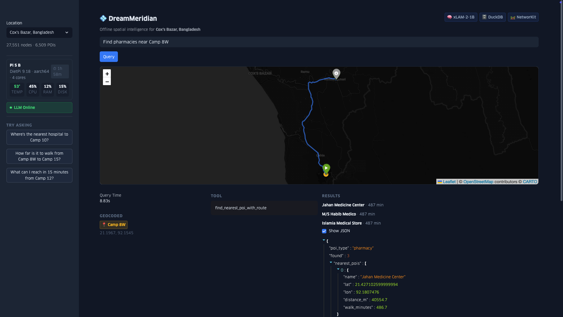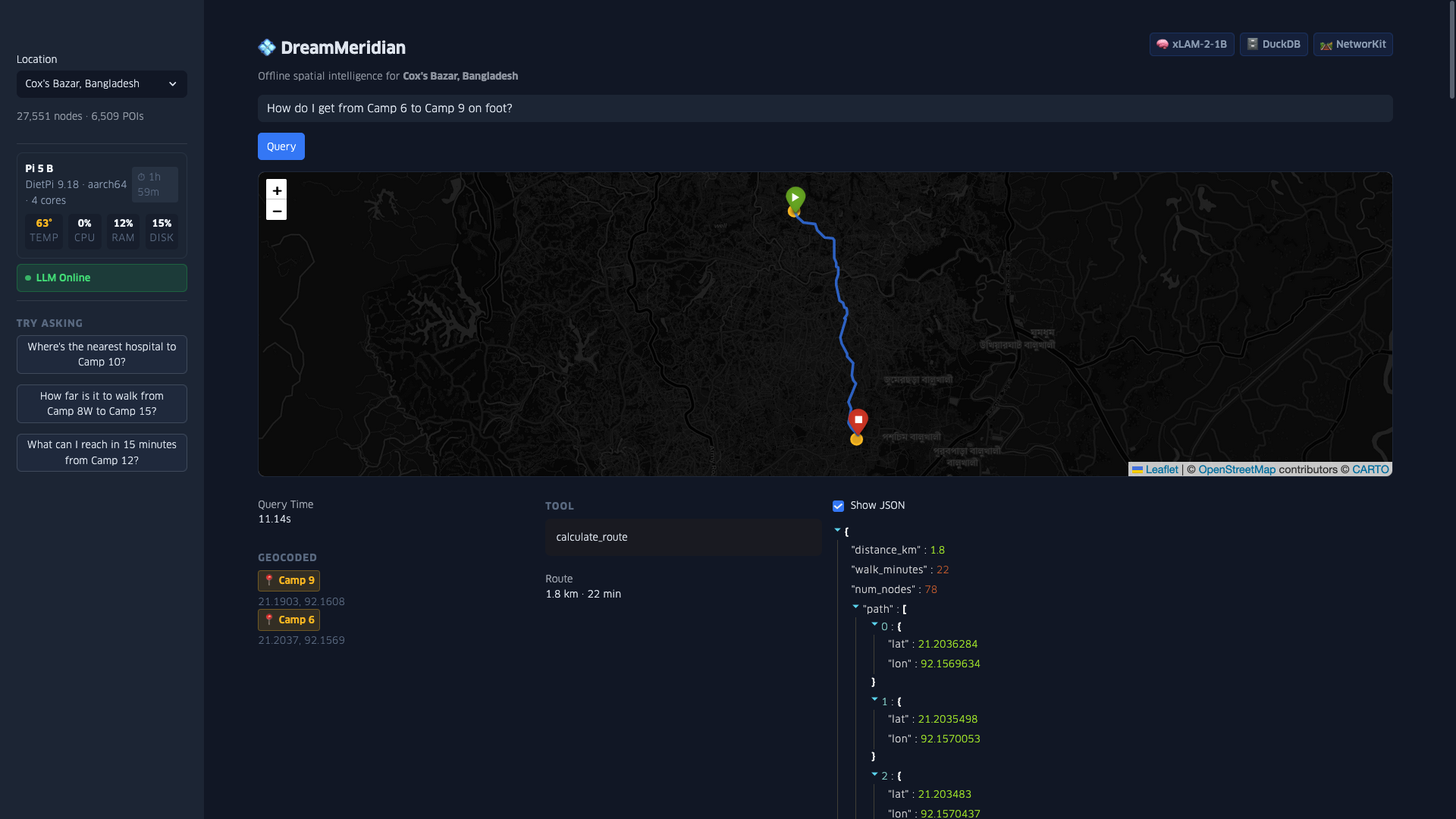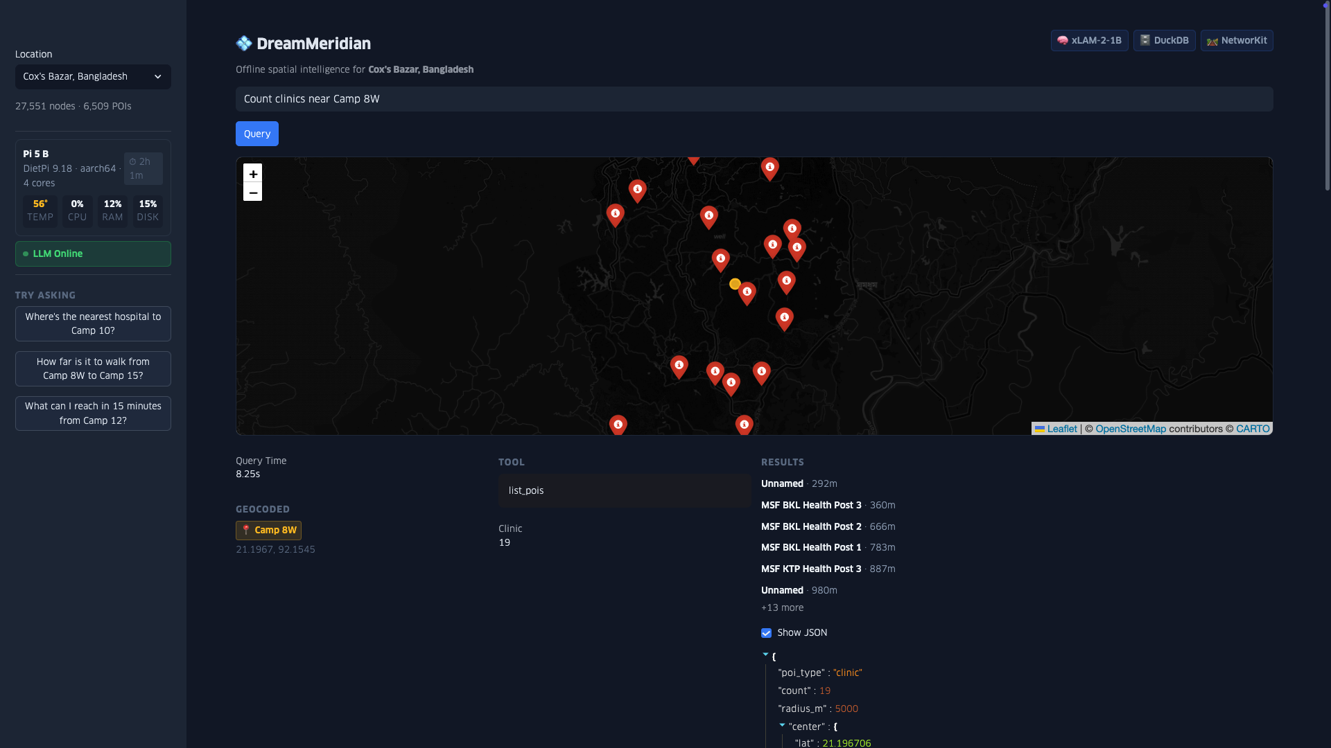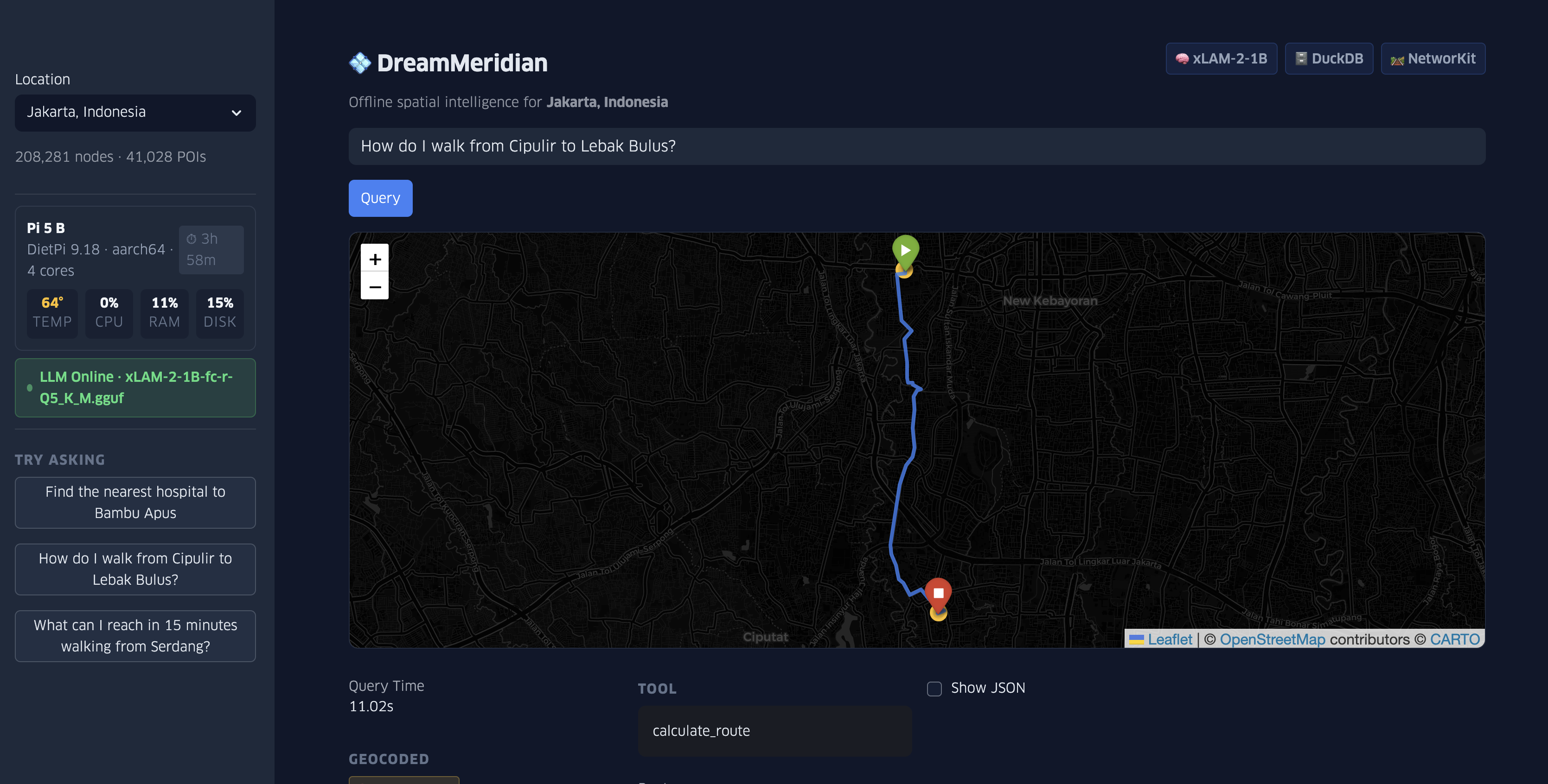 DreamMeridian answers natural language spatial queries entirely on-device on a Raspberry Pi 5. Ask "Find hospitals within 2km of Camp 8W" in Cox's Bazar, "How do I walk from Condado to Santurce?" in San Juan, or "Is there a pharmacy near Gelora?" in Jakarta, and get real answers with walking routes and distances in under 11 seconds. No internet, no cloud, no GPU. Just a $120 ARM board running at under 10 watts.