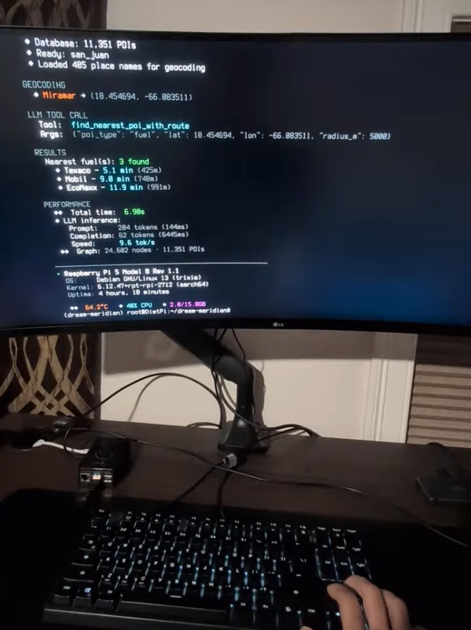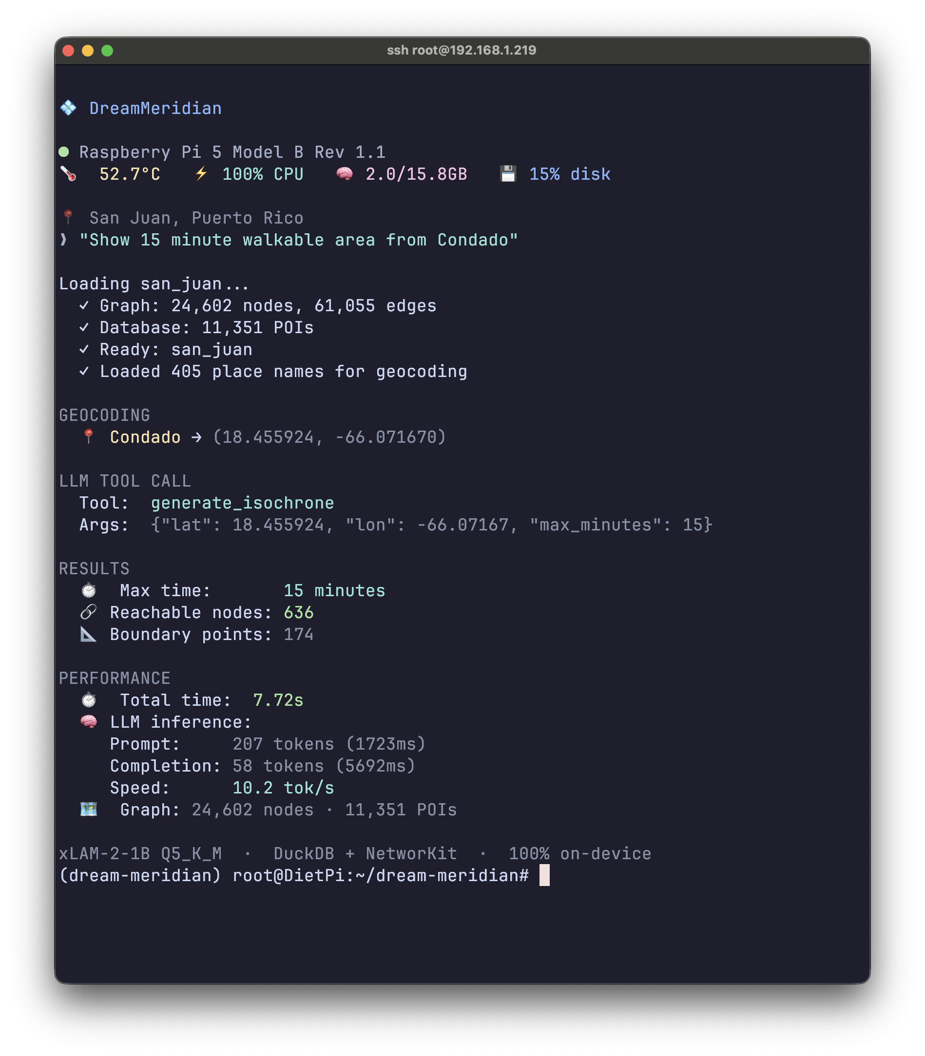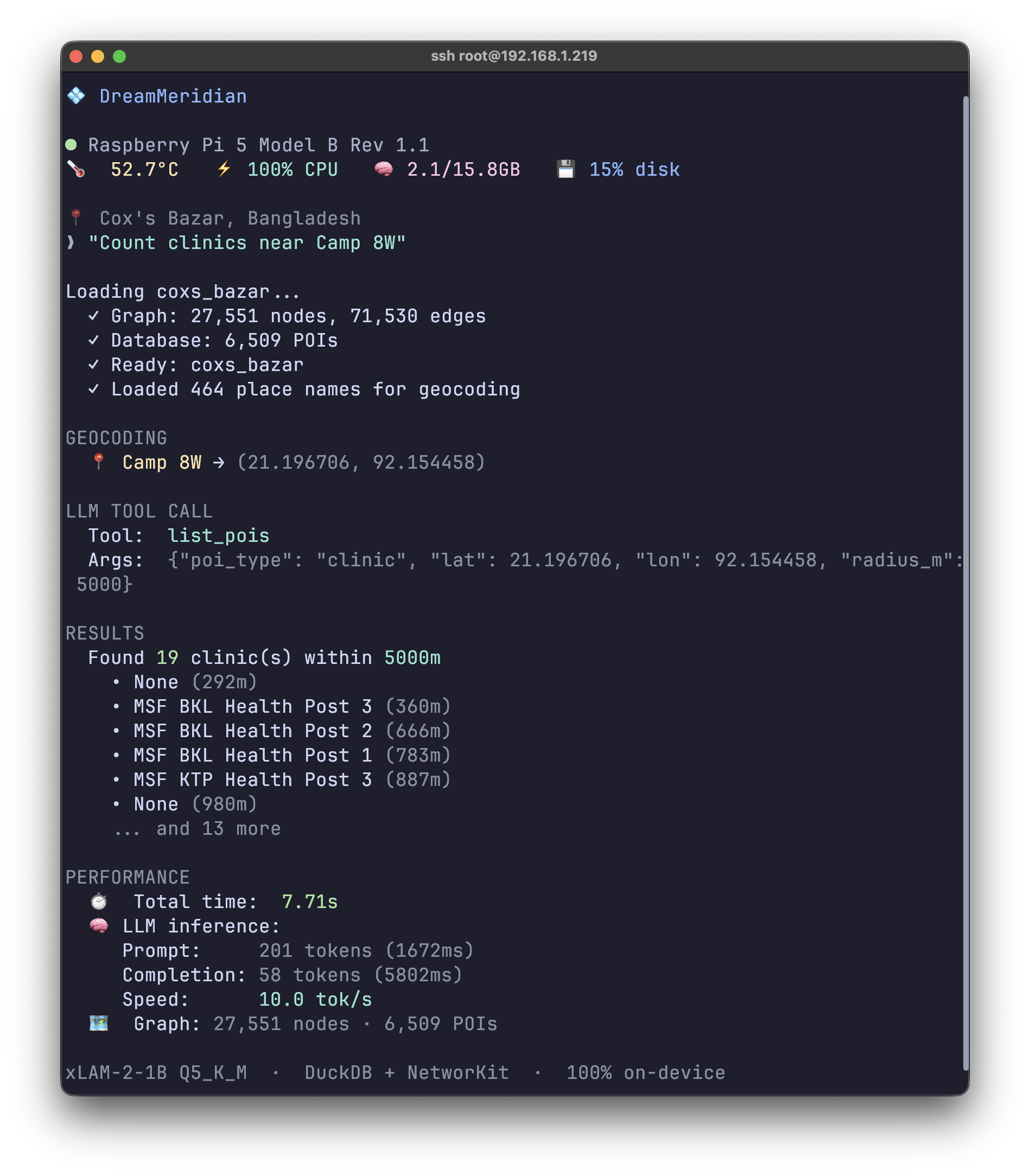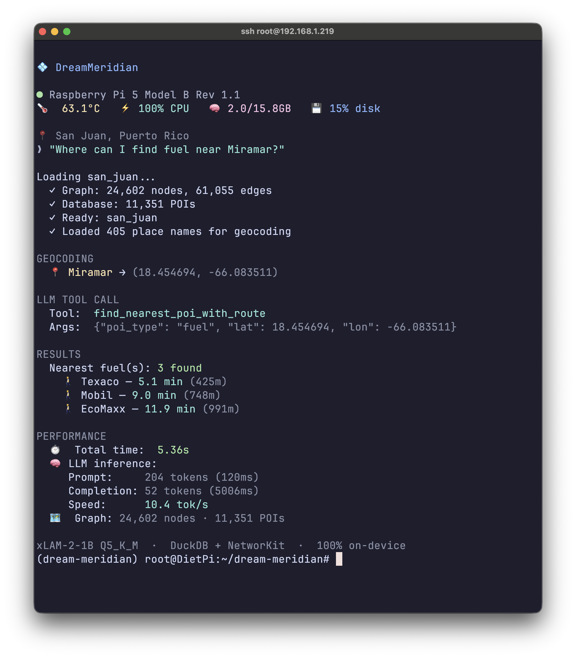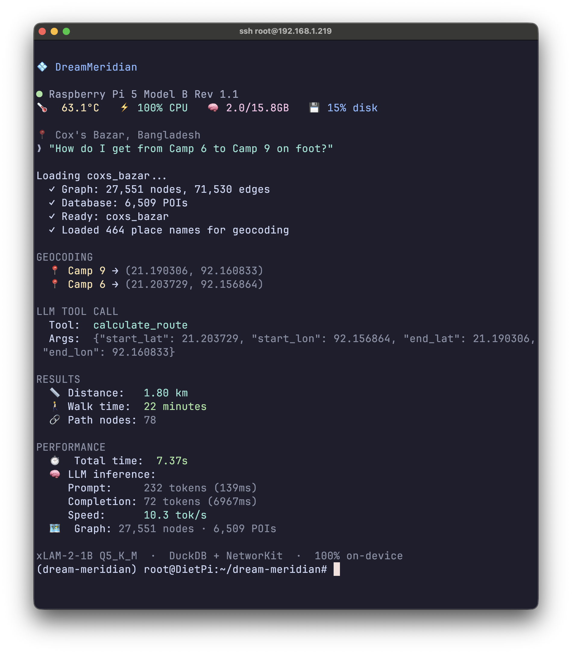 DreamMeridian answers natural language spatial queries entirely on-device on a Raspberry Pi 5. Ask "Find hospitals within 2km of Camp 8W" in Cox's Bazar, "How do I walk from Condado to Santurce?" in San Juan, or "Is there a pharmacy near Gelora?" in Jakarta, and get real answers with walking routes and distances in under 11 seconds. No internet, no cloud, no GPU. Just a $120 ARM board running at under 10 watts.