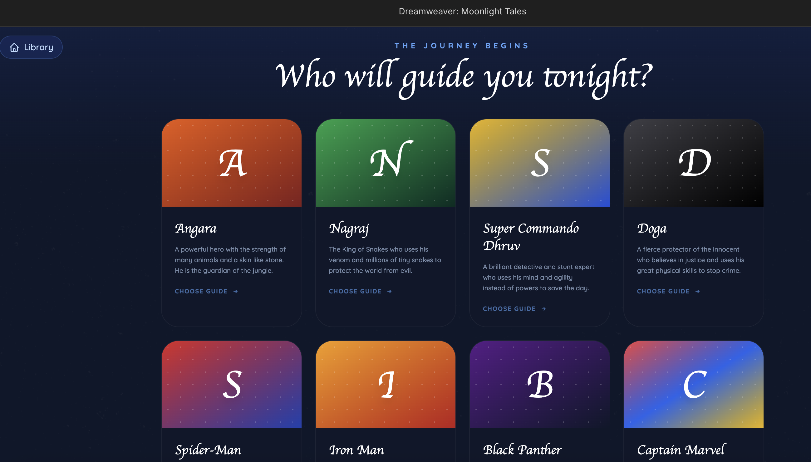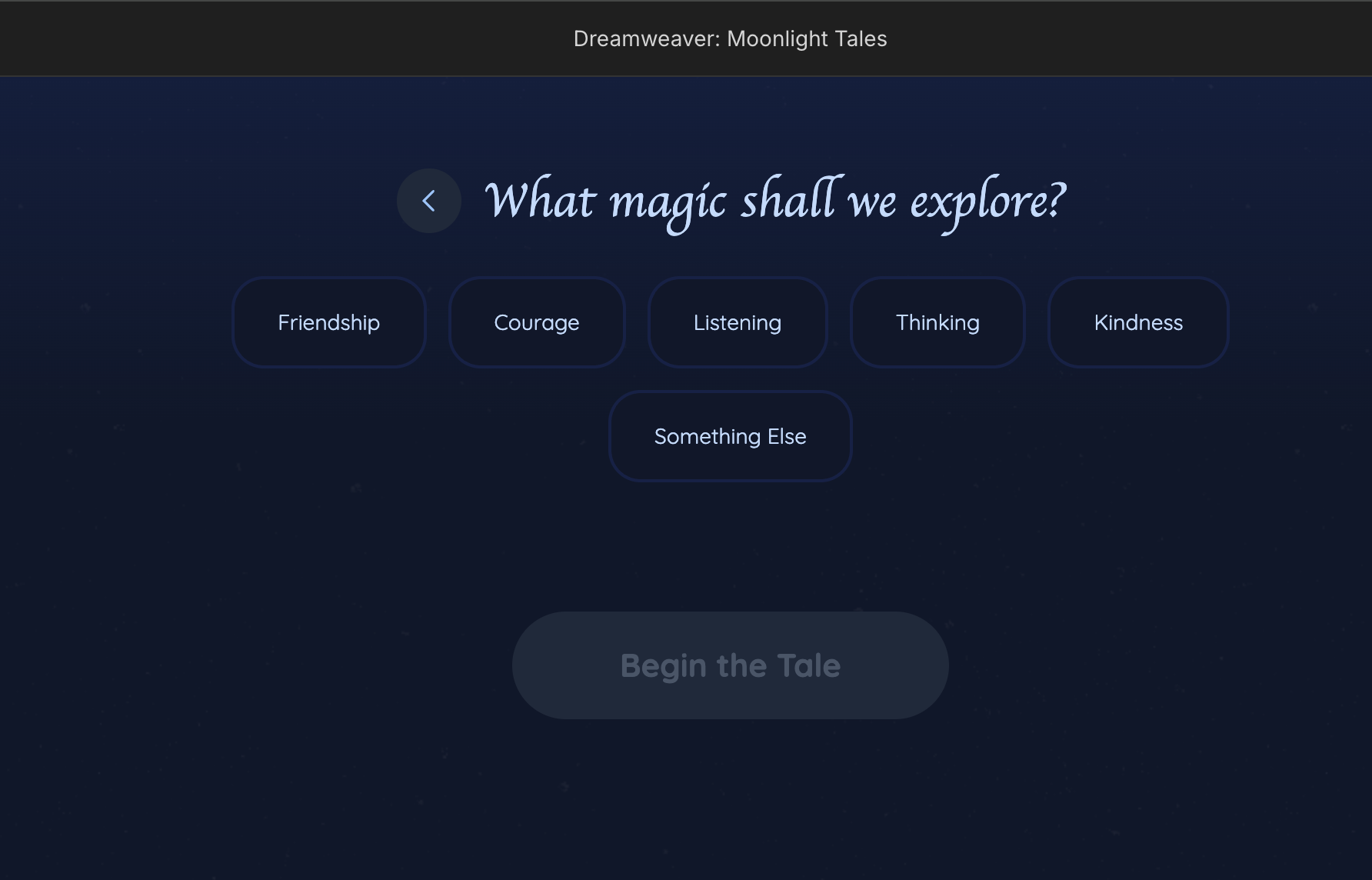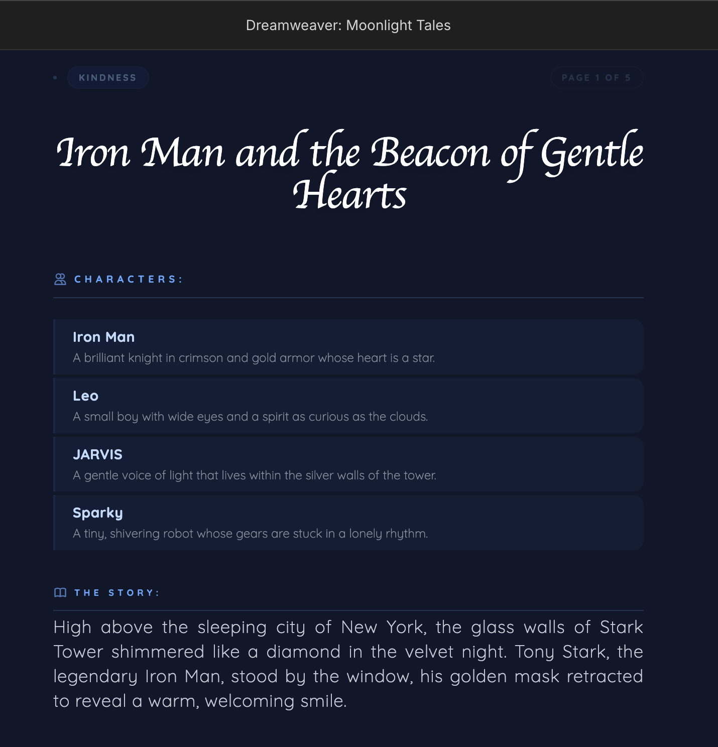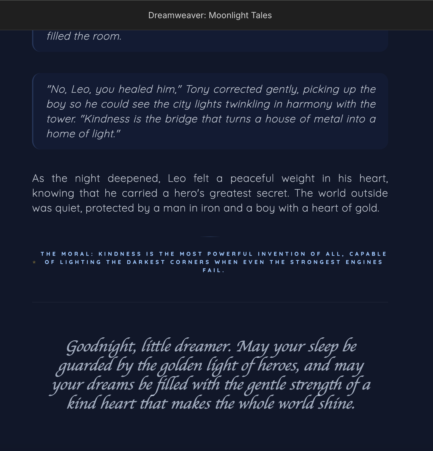 What it does Dreamweaver: Moonlight Tales is a Gemini powered bedtime storytelling companion for young children and their parents. It creates calming, moral‑based stories that parents read aloud thus preserving the warmth and connection of bedtime. It is a web-based app and is built around a core idea of: Parent + Child Co‑Creation Mode