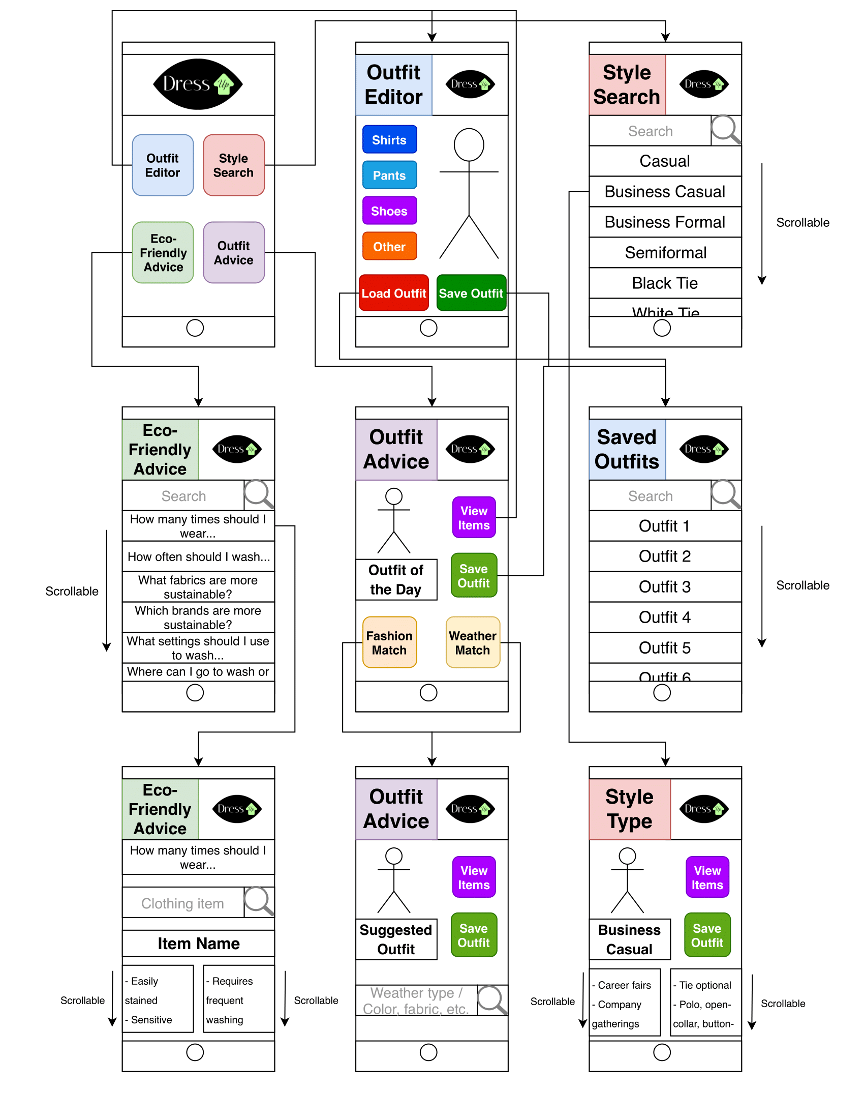 For now, Dress Up is confined to a visual diagram of how the app would be built and how different buttons and pages would connect to each other. To do this, I used draw.io to create examples of each type of page on the app.