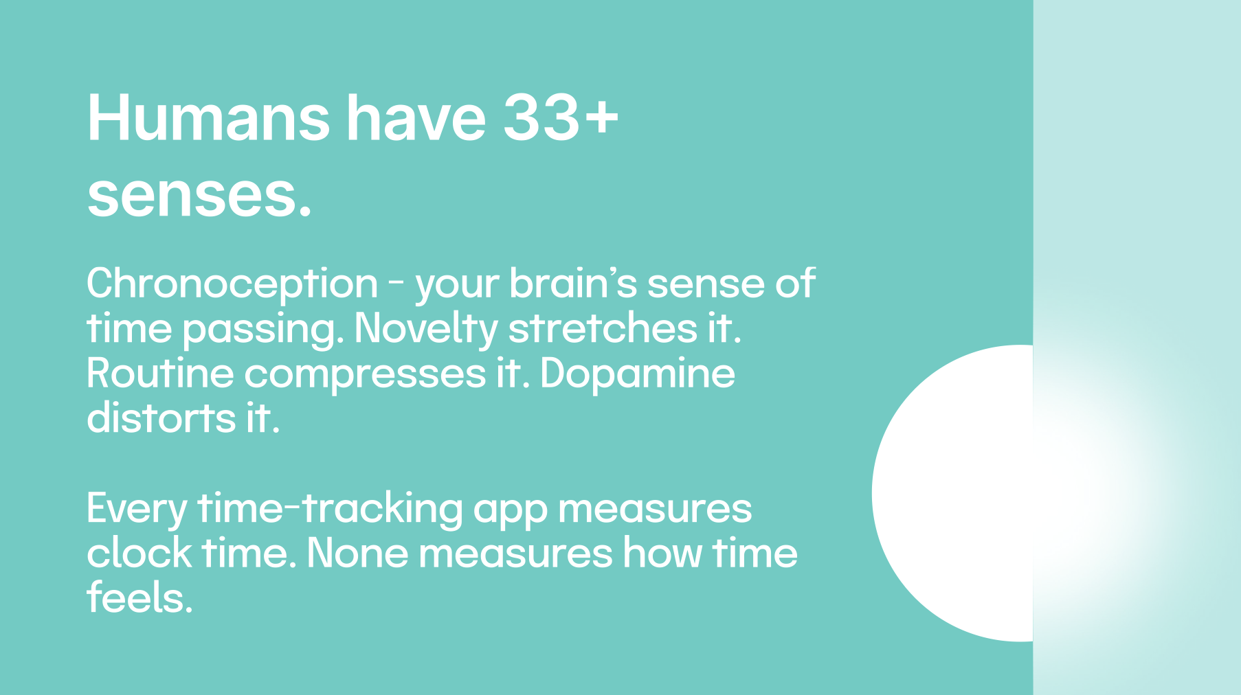 Then we found out this has a name - chronoception. One of 33+ recognized human senses. Your brain's internal clock, and it distorts based on novelty, attention, and dopamine. Every time-tracking app measures clock time. None measures how time feels. The life we moved 8,000 miles for was quietly disappearing.