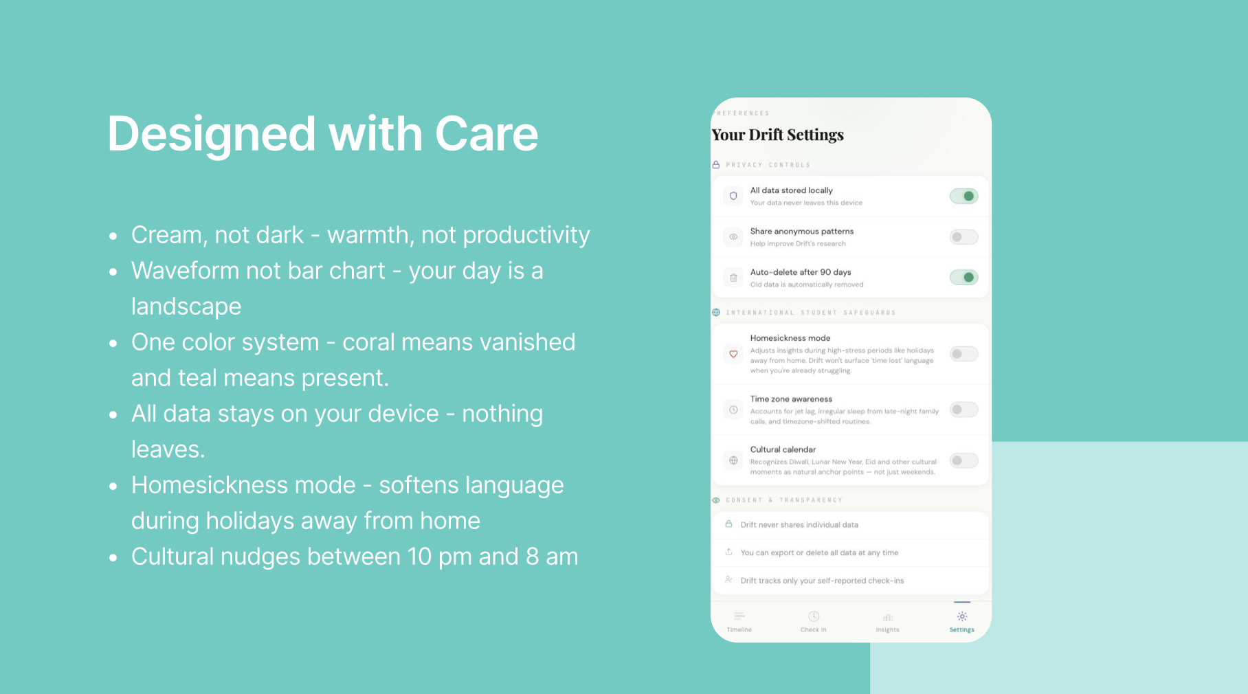 5.3 million international students worldwide are living compressed versions of the experience they uprooted their lives for. Drift is asking them to actually feel it.