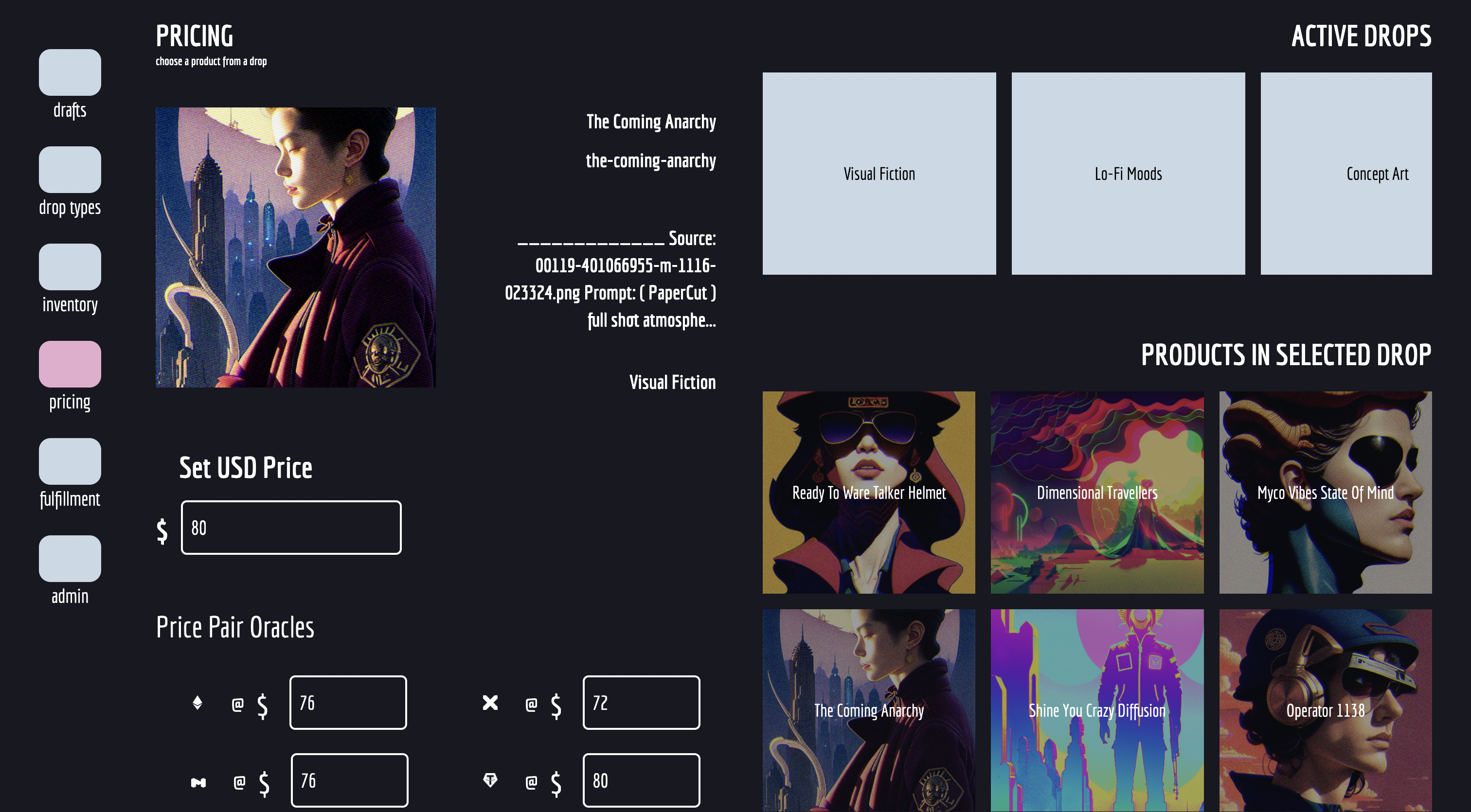 Streamline the drop management process, with the ability to set multiple prices on individual products in fiat and crypto, source on demand token pair information from Chainlink oracles, and persist file storage through IPFS.