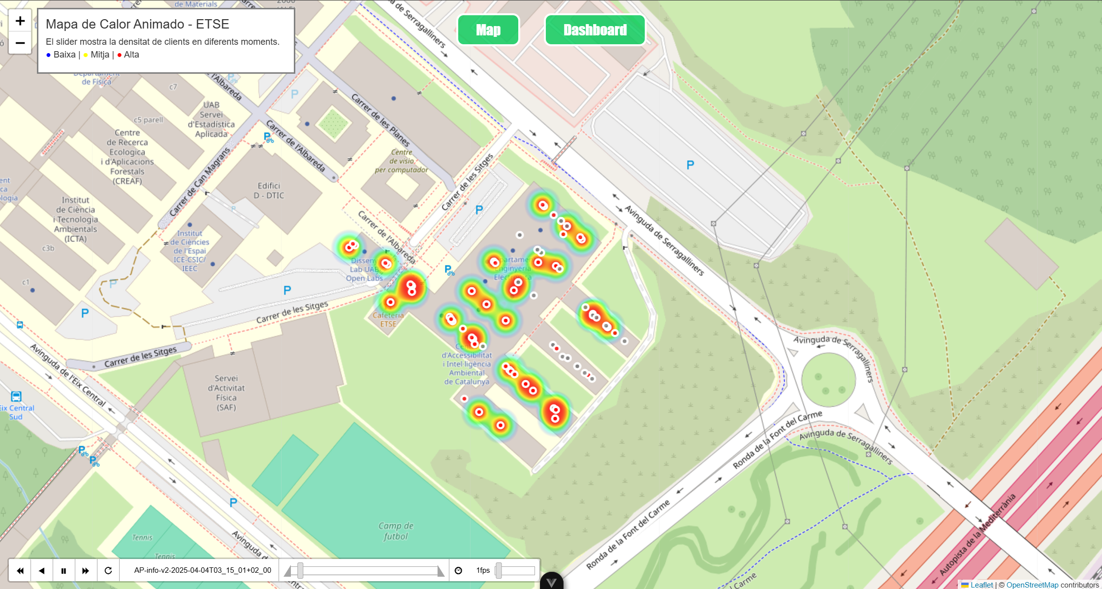 Aquest projecte és una eina per analitzar l’ocupació dels punts d’accés (AP) del campus de la UAB, amb la intenció de visualitzar de manera gràfica la distribució i densitat d’usuaris al passat, present i futur.