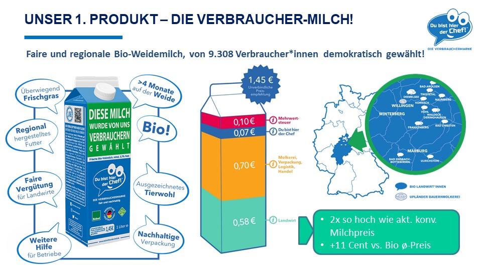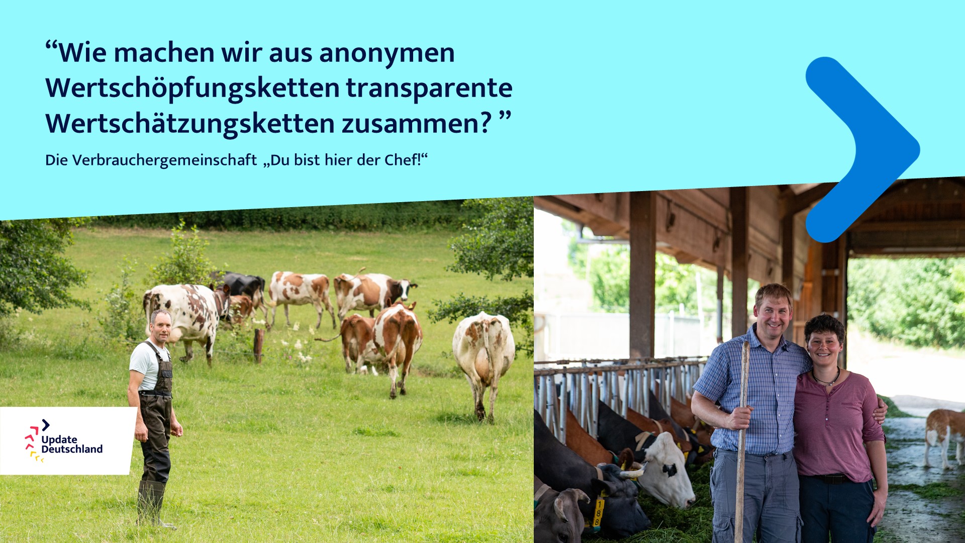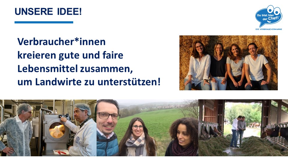 Wo kommen unsere Lebensmittel her? Wie wurden sie produziert? Wo geht unser Geld hin und welches System unterstützen wir mit jedem Kauf? Viele Fragen, kaum Antworten! Um Verbraucher*innen Transparenz und Mitbestimmung im Lebensmittelmarkt und damit die Kontrolle über ihre Ernährung zurückzugeben, haben wir die Initiative „Du bist hier der Chef! Die Verbrauchermarke“ gegründet: ab jetzt entscheiden wir selbst, wie unsere Lebensmittel produziert werden sollen und bestimmen den entsprechend fairen Preis mit. Zusammen geben wir Höfen und Landwirtsfamilien eine neue Perspektive und ermöglichen, produzierenden Landwirten besser und nachhaltiger zu wirtschaften: im Einklang mit der Natur, mit mehr Tierwohl und Förderung von Biodiversität.