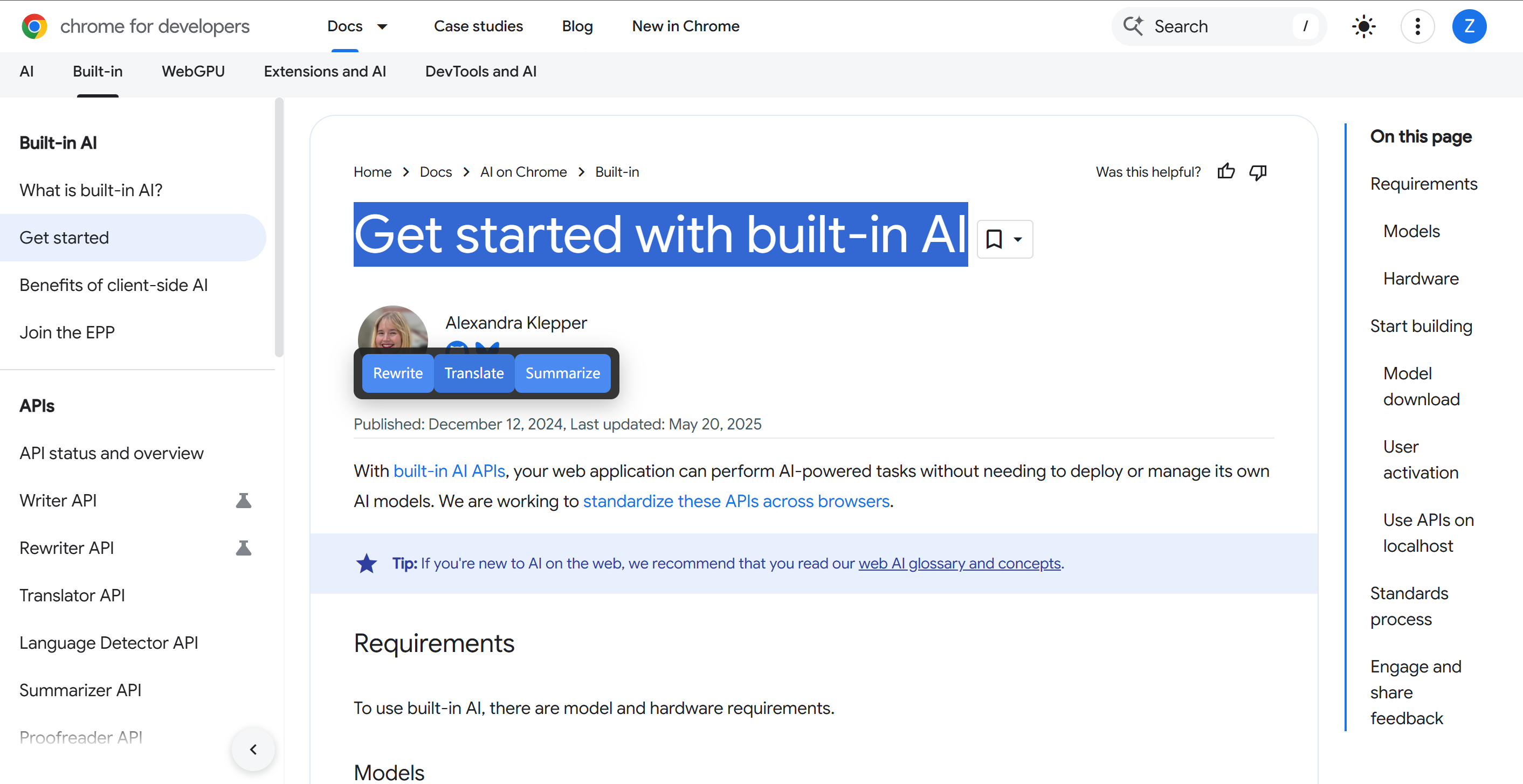 - Architecture & UI: A Side Panel with “Translation” and “Writing” pages, plus a floating toolbar for one-click translation; a Settings page for persisting target language and preferences.