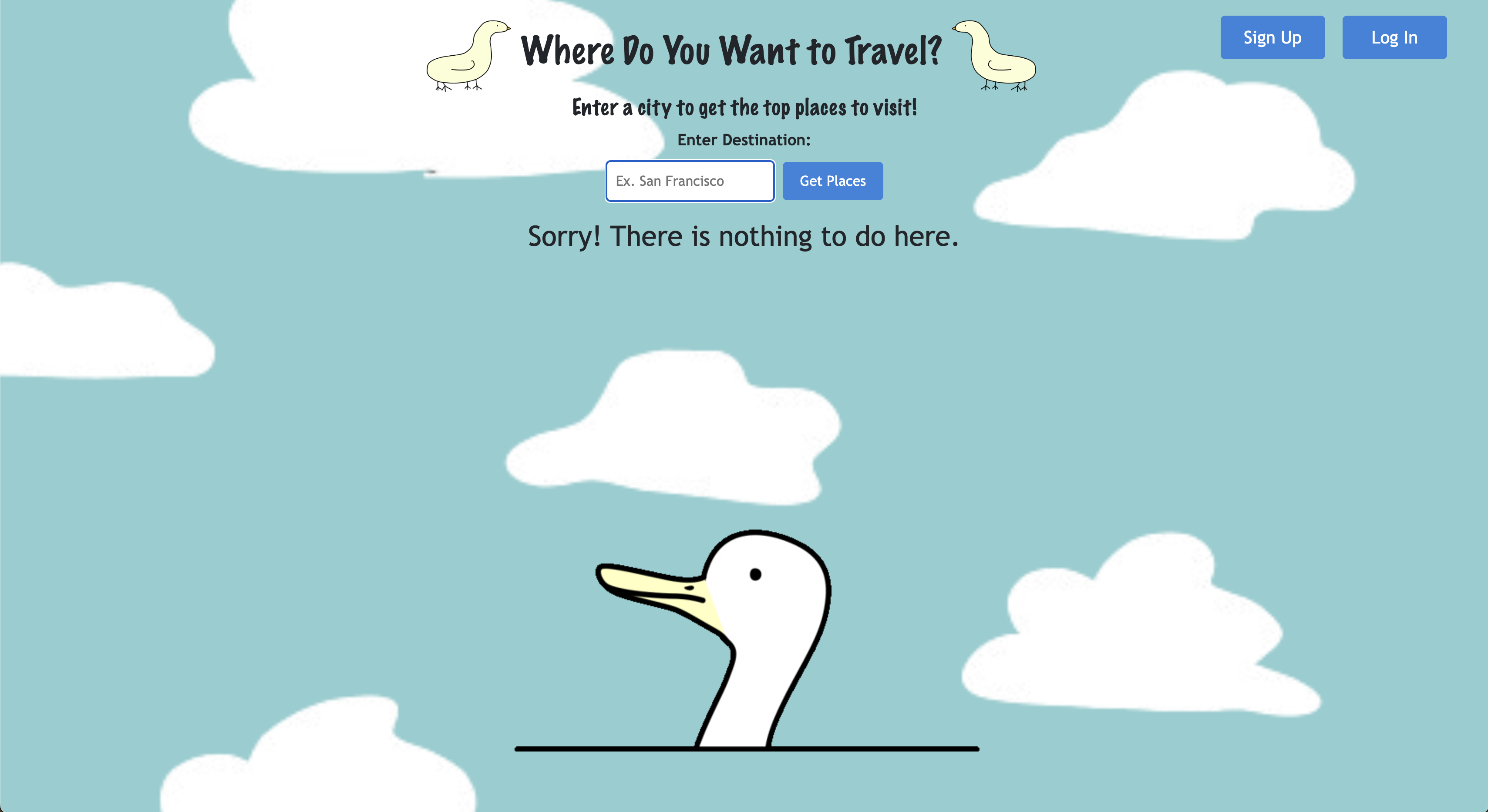 Our project is very simple and straightforward. Duck Hunt uses the Travel Advisor API to supply the user with information about popular attractions based on a specific city. The user is first asked to enter the city in which they want to travel, in which Duck Hunt will give the top attractions with a description of the name, address, an image and other specifics about the spot.