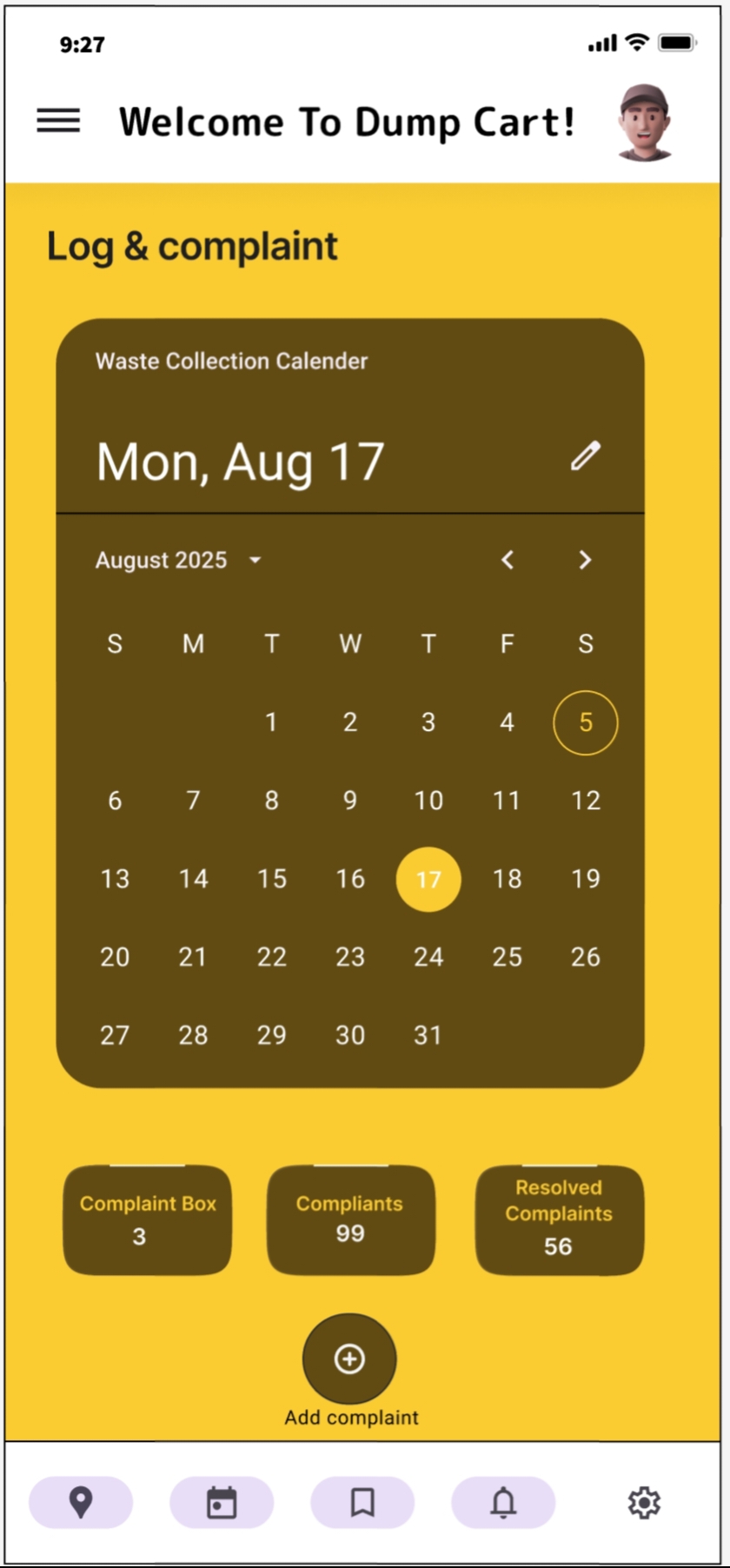 Dump Cart is a mobile application that tracks garbage trucks in real-time, allowing users to see when their area’s waste will be picked up. The app features a dynamic calendar that highlights both regular and exceptional pickup dates, offering full transparency of the collection schedule. In case of a missed pickup, users can submit complaints to local authorities, ensuring accountability and timely resolution. Through these features, Dump Cart works to reduce pollution, foster cleaner surroundings, and promote sustainable urban development.