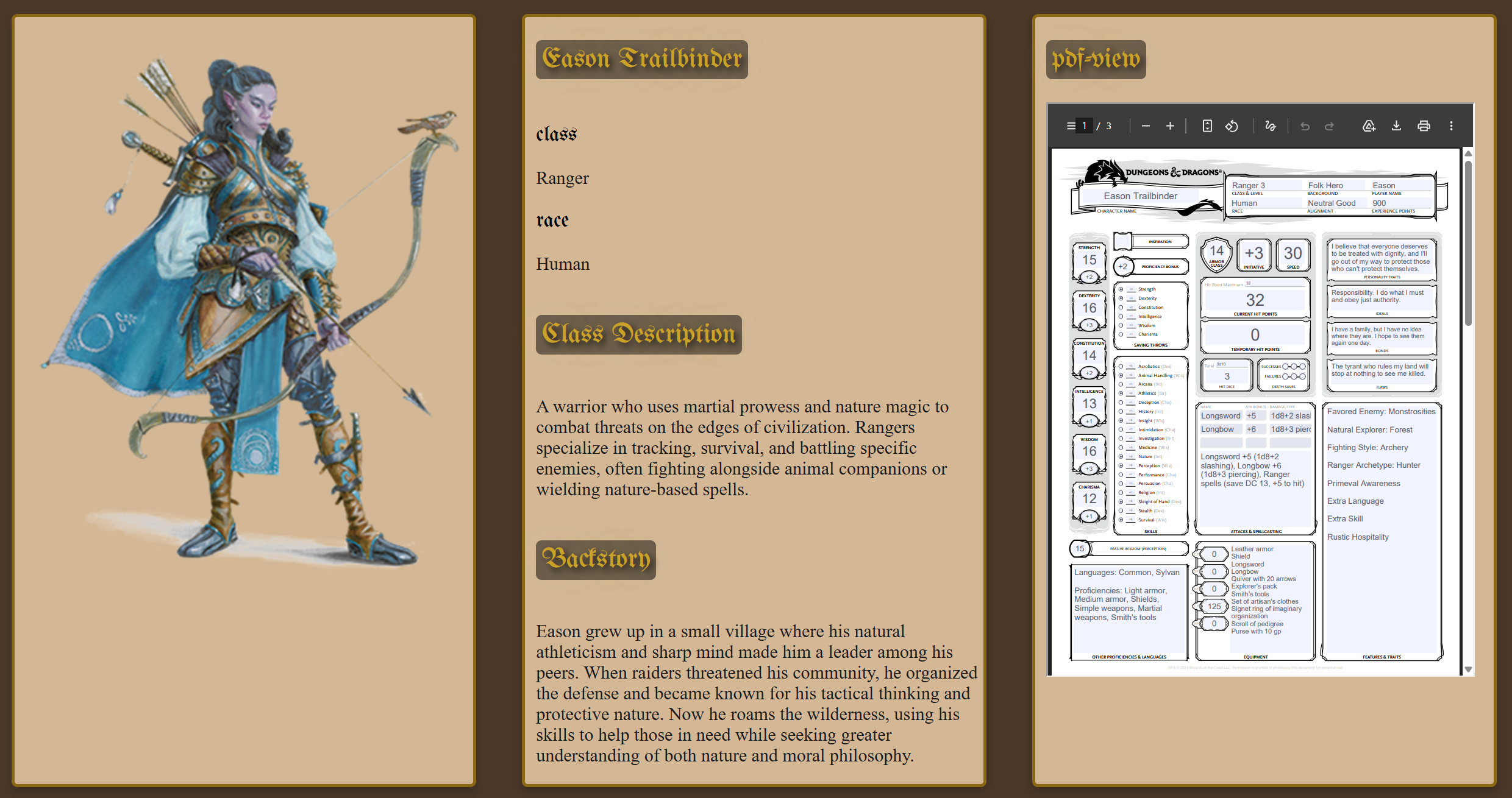 Our user interface that shows once our character sheet is ready, displaying your characters picture, their information, and a pdf view.