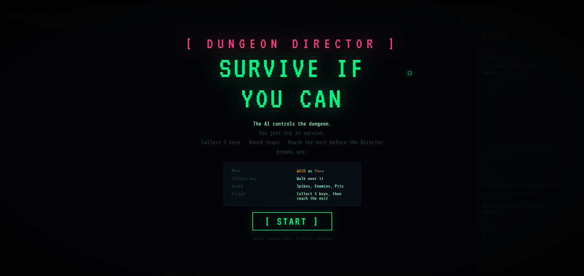 The player must collect keys, avoid traps and enemies, and reach the exit. Meanwhile, the AI Director dynamically changes the dungeon by triggering events such as: