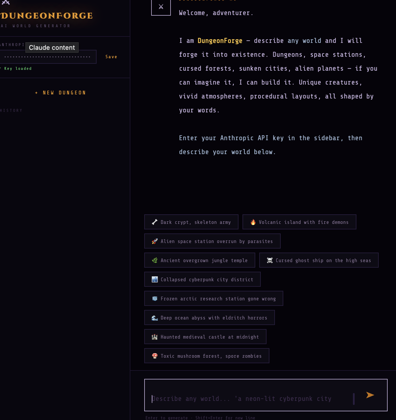 Lately, I’ve been wanting to play dungeon-style games, but many of the existing ones feel repetitive or limited. I thought it would be interesting to create a system where you could generate an entirely new dungeon game just by describing it, making every experience unique.