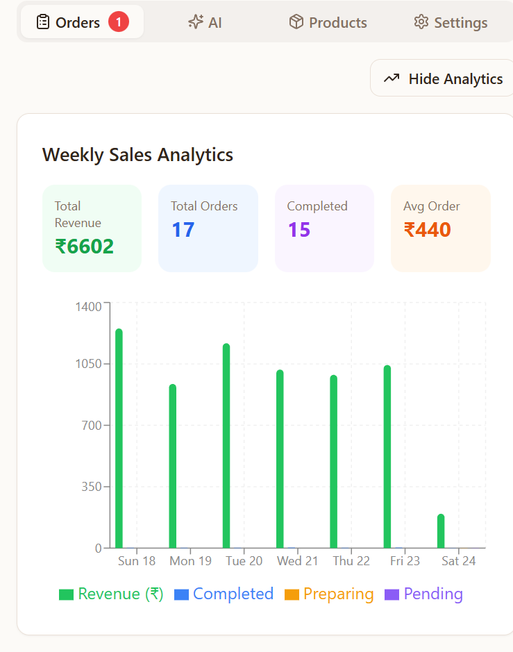 Automatic Inventory Management: Successfully implemented a robust system that automatically reduces stock when orders are accepted, with validation to prevent overselling AI Integration: Integrated Claude API to provide shopkeepers with intelligent business insights, making the platform truly smart User Experience: Created intuitive interfaces for both customers and shopkeepers with real-time updates and visual feedback Scalable Architecture: Built a modular, context-based architecture that's easy to maintain and extend Complete Feature Set: Delivered a full-stack solution with order management, inventory tracking, analytics, and AI assistance - a complete business tool for local shops