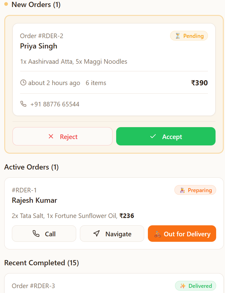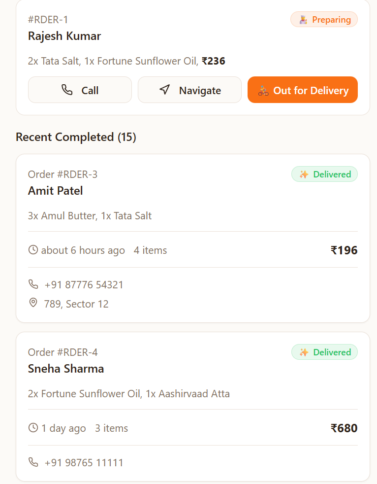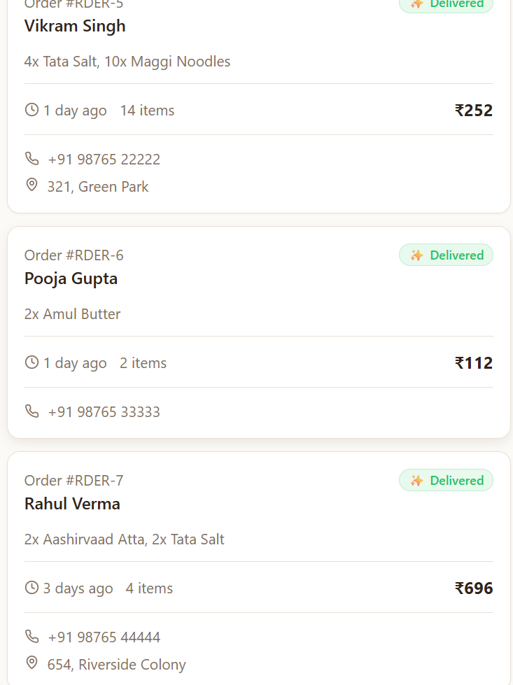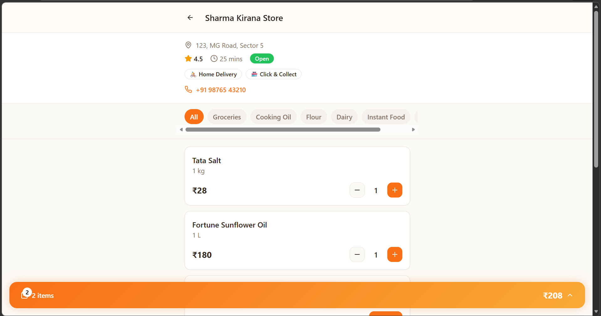 Supabase Integration: Migrate from mock data to full Supabase backend with real-time database subscriptions for live inventory and order updates WhatsApp Integration: Implement automated WhatsApp notifications for order confirmations, status updates, and delivery alerts using WhatsApp Business API Payment Gateway: Integrate UPI, card payments, and cash-on-delivery options for seamless transactions Delivery Partner Network: Build a system to connect with local delivery partners and bike riders for efficient order fulfillment Advanced Analytics: Add predictive analytics, demand forecasting, and inventory optimization suggestions Multi-shop Onboarding: Create a self-service onboarding flow for shopkeepers to register their stores, add products, and go live independently Customer Loyalty Program: Implement rewards, discounts, and referral systems to increase customer retention Voice Ordering: Add voice-based ordering for elderly customers and those less comfortable with apps Batch Order Processing: Allow shopkeepers to accept multiple orders at once during peak hours Smart Routing: Implement intelligent delivery route optimization for faster deliveries Mobile Apps: Develop native iOS and Android apps for better performance and offline capabilities Expansion: Scale to multiple cities and support regional languages for wider adoption