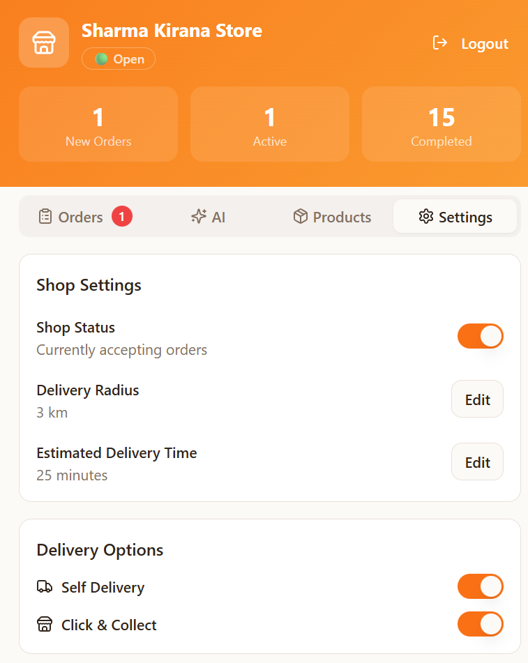 Customer App: Browse nearby shops by category (kirana, medical, stationery, vegetables), add items to cart, choose between self-delivery or click & collect, and track orders in real-time Shopkeeper Dashboard: Manage inventory with automatic stock tracking, accept/reject orders, update order status (preparing → out-for-delivery → delivered), view sales analytics, and get AI-powered business insights Smart Inventory Management: Automatic stock reduction when orders are accepted, low-stock alerts, and manual stock updates AI Assistant: Powered by Claude API, providing shopkeepers with business insights, sales analysis, and order management recommendations Real-time Order Tracking: Customers can track their order status with visual progress indicators Multiple Delivery Options: Self-delivery, click & collect (pickup), and local helper integration